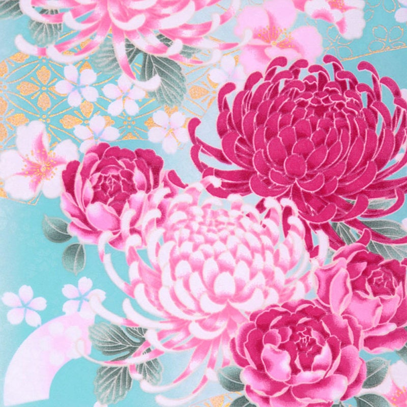 →襦袢はこちら→襦袢の身上げ・肩上げはこちら【カラー】爽やかな水色地に金彩で扇面地紙文を描き、華やかな色合いの菊の花をちらしました。瑞々しく晴れやかな印象のお着物です。
