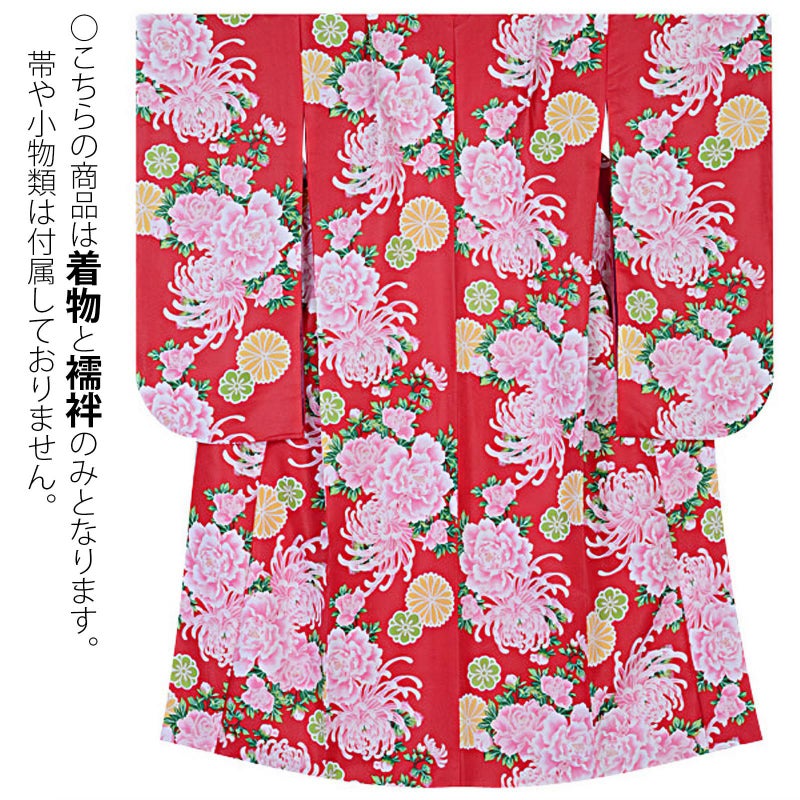 【カラー】華やぎの赤地に、菊と牡丹の大輪の花を咲かせて、赤に大胆に配した菊と牡丹の文様に心奪われるお着物です、若さあふれる着姿を適えてくれます。