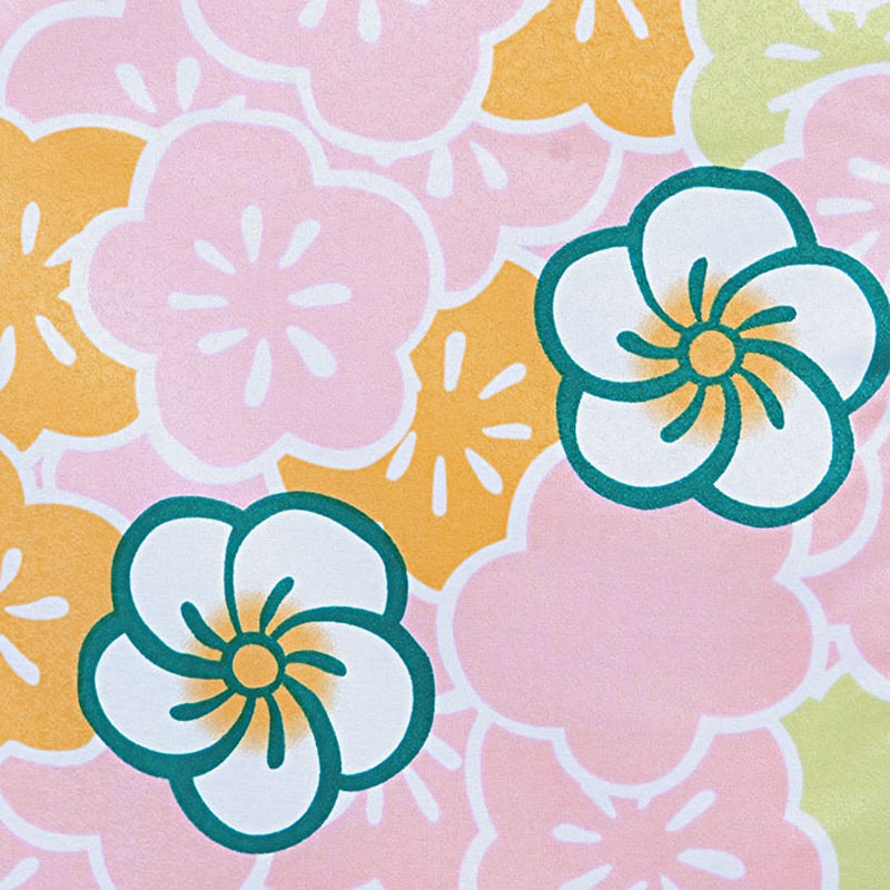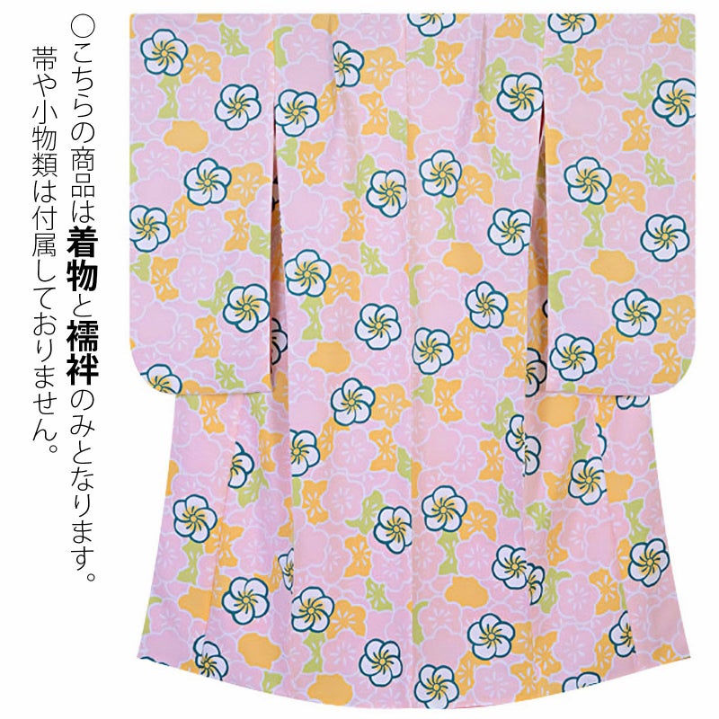 【カラー】ふんわりピンクの梅を主に、黄色・黄緑の梅をところどころに配した梅柄で埋めた地に、ねじり梅を散らせて、梅尽くしのお着物です。やさしい配色が心をとらえるデザインです。