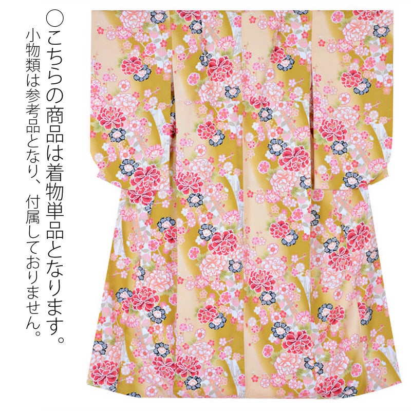 →襦袢はこちら→襦袢の身上げ・肩上げはこちら【カラー】芥子色・ベージュで暈し染めた地に、牡丹の花をメインに桜や梅の花を描いたお着物です、地色と文様は鮮やかな色の対比が美しいデザインです。