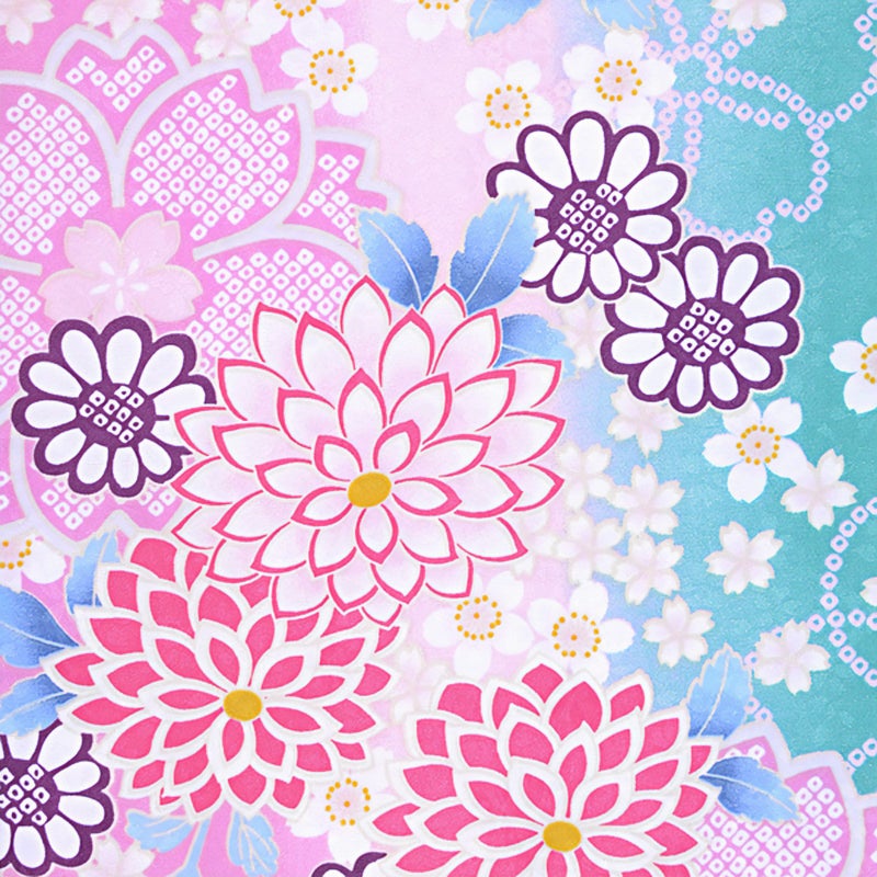 →襦袢はこちら→襦袢の身上げ・肩上げはこちら【カラー】ピンクと緑で暈し染めた地に、菊と桜の柄を表現して、ピンクの甘さが緑色により抑えられて、ほどよい可愛さのデザインです。