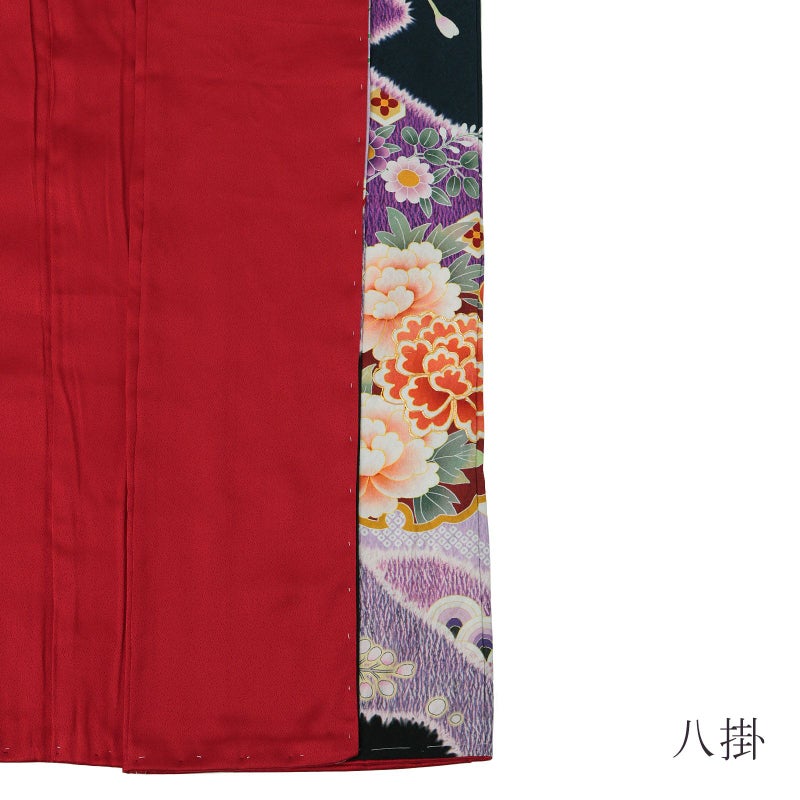 黒に近い深い藍色の地は、細かな地模様の立体感があります。裾は黒。紫色、藤色を基調とした絞りの霞、松皮菱の合間に、枝垂桜が伸びやかに描かれています。亀甲や七宝の吉祥柄、雪輪に桜や菊、牡丹などの花々が橙色やピンクの濃淡などの配色で表現され、金駒刺繍が高級感を添えています。辻が花調の抽象的なお花が個性的な振袖です。八掛は深い赤。