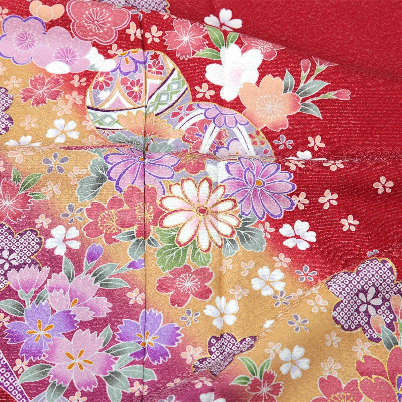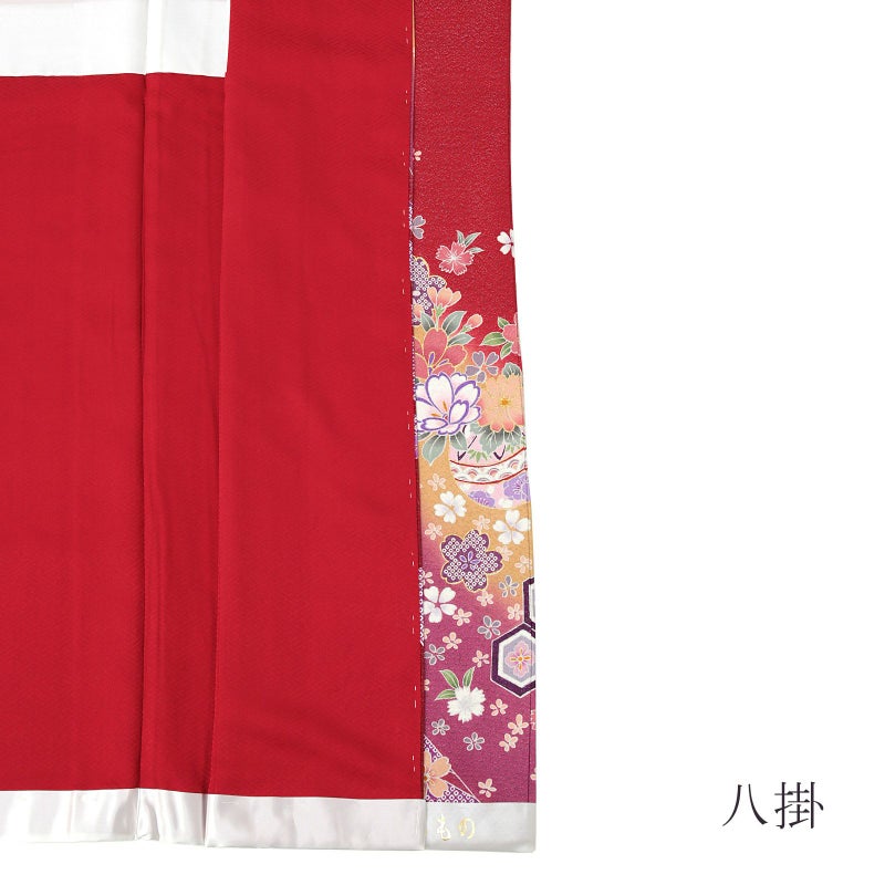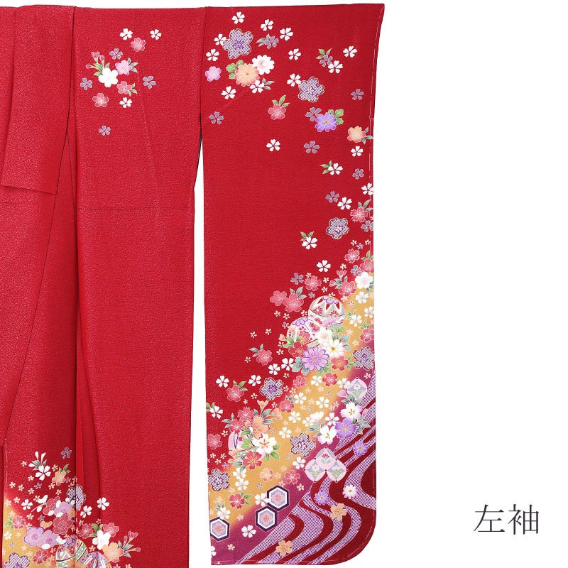 細かな地模様のある銀通しの地はやや鈍く輝く赤色。裾は淡いからし色と赤紫のぼかし。白やピンク色系、藤色の疋田の桜を中心に、浅い赤や薄橙、桃色の梅や撫子、菊、牡丹などの花々。淡い青藤色に薄ピンクの手毬。裾に紫の流水。淡くくすんだ色合いが控えめな中に上品さを湛えています。八掛は紗綾形の地模様の赤。
