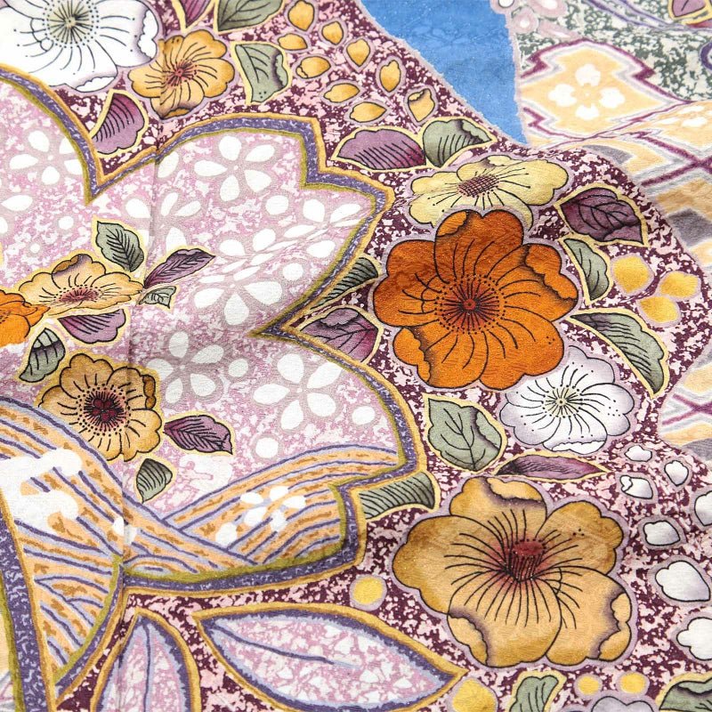 桜の地模様に金通しのラメ感のある生地。深い青紫の地色にブルーや濃紺のぼかし。金茶色を基調に、紫紺や深緑、グレーの束ね熨斗。浅い橙色や黄土色、白、赤藤色の辻が花調の花紋、藤や楓、桜など。ブルー系の個性が際立つ色遣いに、絞り調の表現がやわらかな印象を添えます。八掛は紺青地に辻が花。