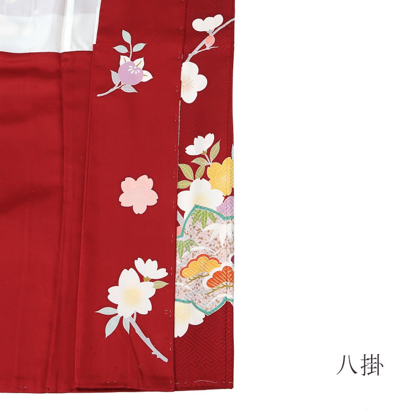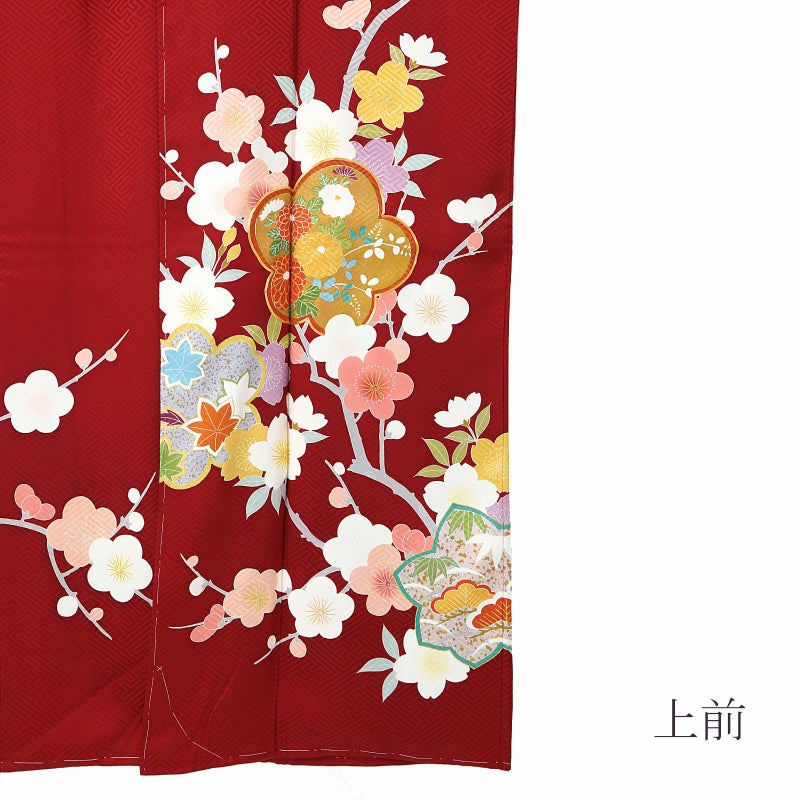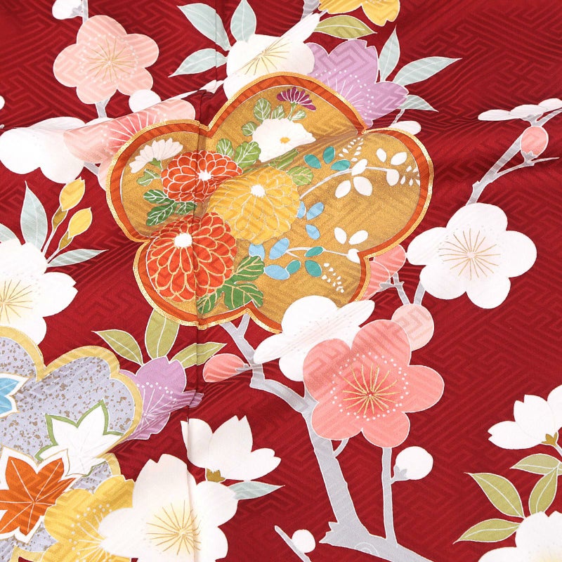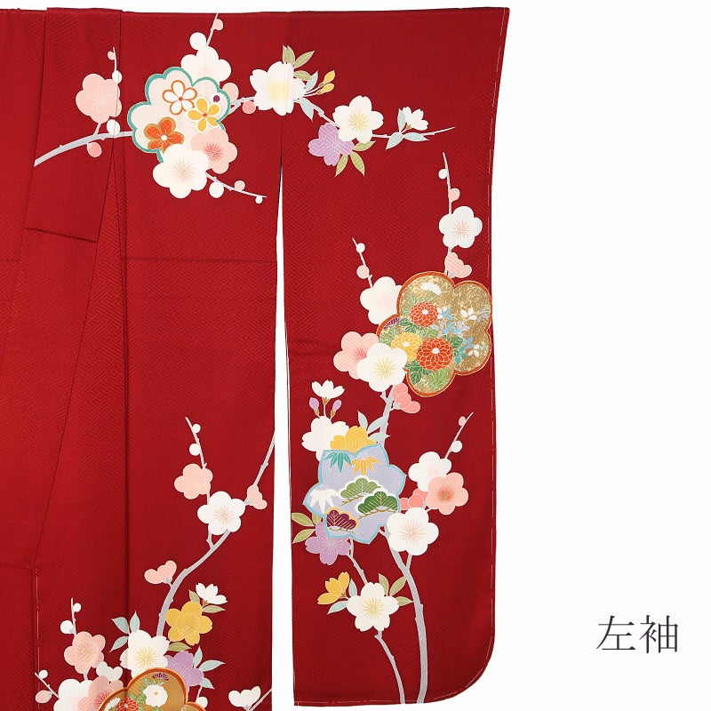 紗綾形の地模様の深い赤地。薄いグレーの枝に白や淡いピンク、藤色や黄色の花の梅と桜が大きく配されています。梅や楓の型に菊など草花を詰めた花紋。花型にほどこされた金駒刺繍が品格のある煌びやかさを添えます。赤地に桜や橘の柄八掛。大胆な文様の配置と古典的な花の文様が際立つ振袖です。