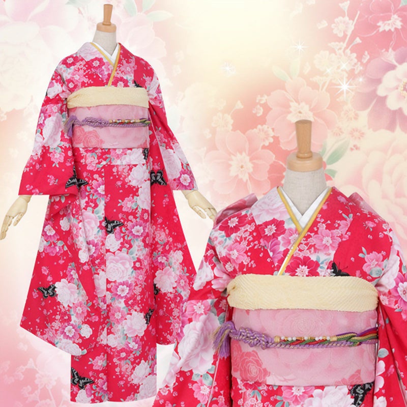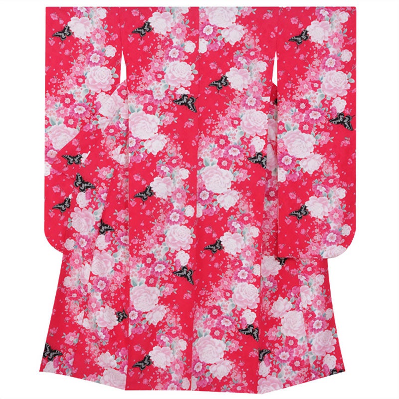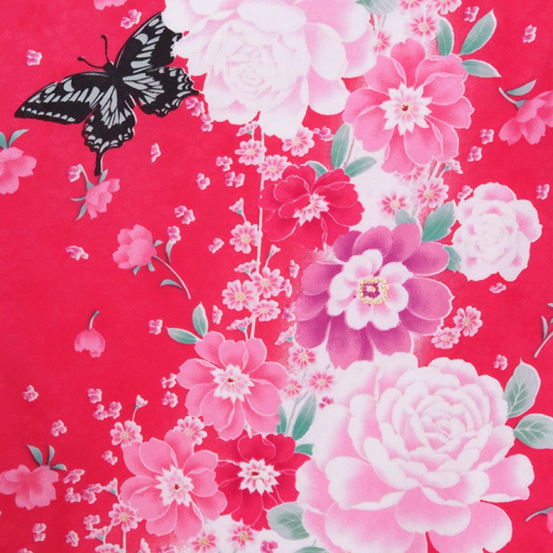 【色柄】鮮やかなローズピンク地に薔薇の花をちりばめ、、印象的な揚羽蝶を配しました。全面を柄でみたす小紋柄ならではの、モダンな華やかさに満ちたデザインです。