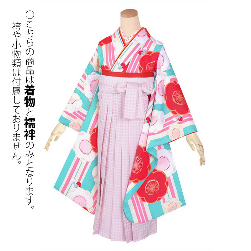 【色柄】ターコイズブルーに、クリーム色・ピンクで縦縞柄をあらわした上に梅の花を配置したお着物です。梅の愛らしい形と縦縞柄のちょっと大人びた雰囲気が調和したレトロ感あるデザインです。