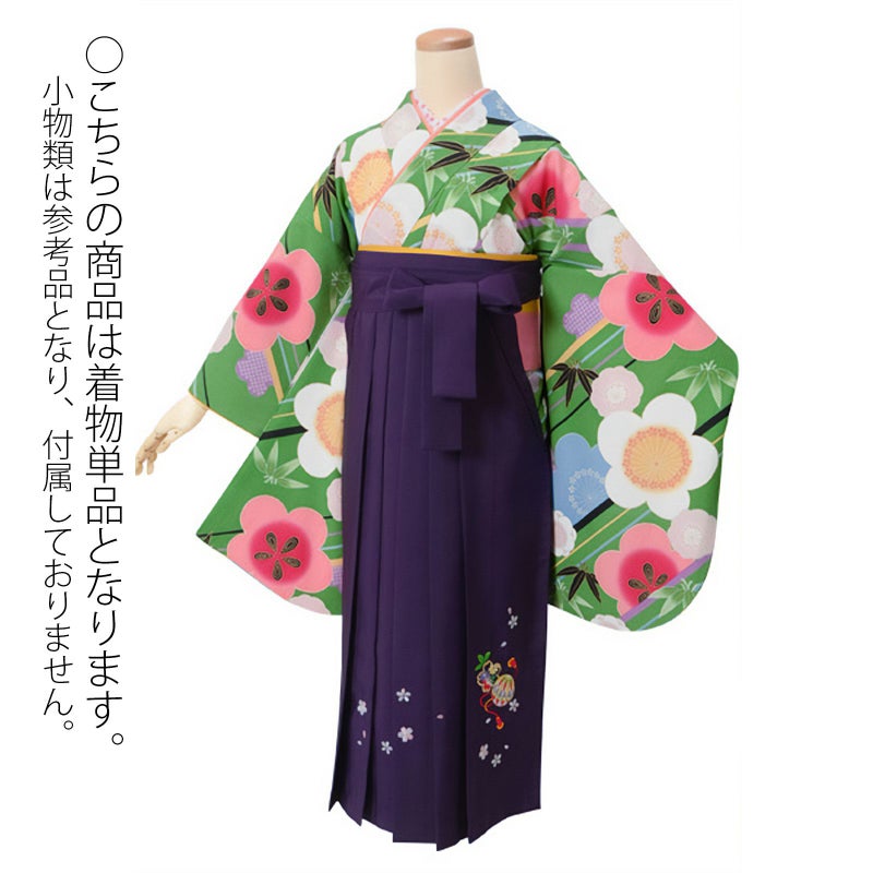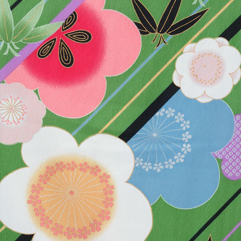【色柄】緑色地色に斜め縞と梅に笹竹をあらわしたお着物です。落ち着いた地色に華やかな文様が可愛いお振袖です。