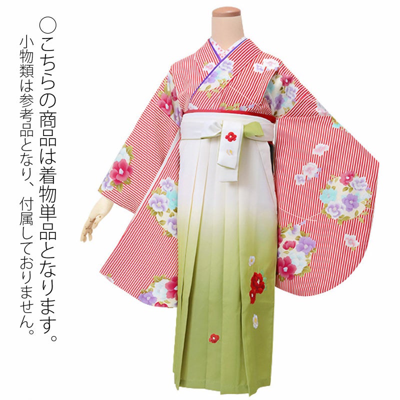 【色柄】クリーム色地色に赤で縦縞をあらわし、椿の花の丸を重ねたお着物です。くっきりとした赤い縞にやさしい色の椿が調和したデザインです。