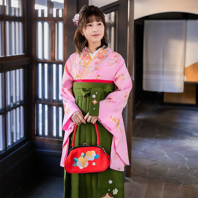 【色柄】ピンクの地に愛らしい薬玉を描いた、明るい雰囲気のお着物です。甘いピンクにターコイズブルーで爽やかさをプラスし、イエローオーカーで落ち着きを添えて…誰からも愛される、優しげなデザインです。