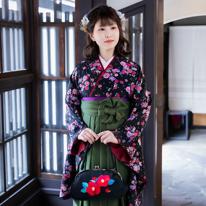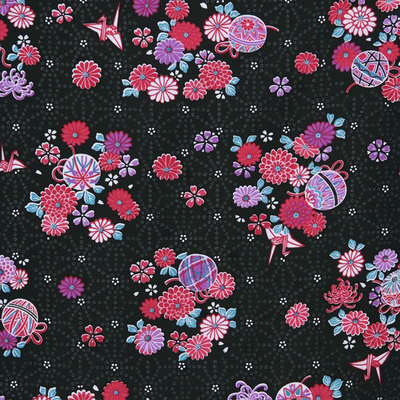 【色柄】伝統モチーフな麻の葉模様に可愛い小花がちりばめられた、明るい雰囲気のお着物です。シックな黒に華やかなコーラルピンクとペパーミントグリーン・パープルが映える、元気でキュートなデザインです。