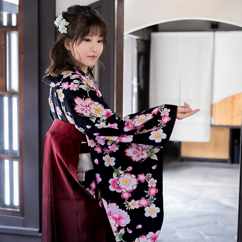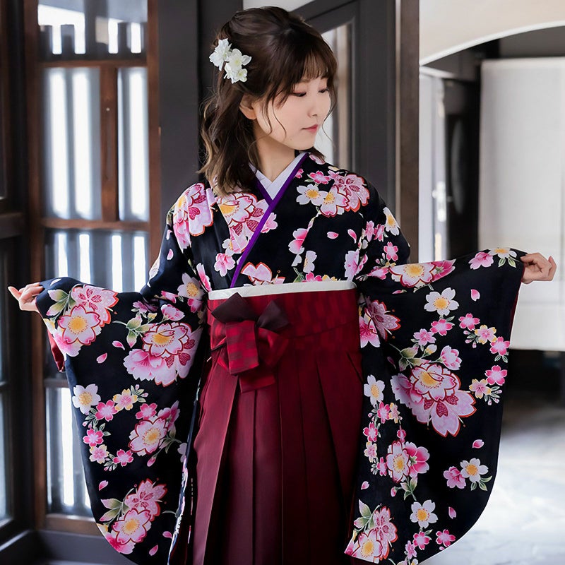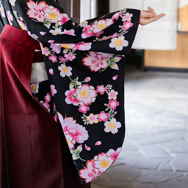 【色柄】シックな黒地に、いろいろな形の桜を重ねた、桜尽くしのお着物です。見ているだけで楽しくなるような、晴れの日にふさわしい明るく華やかなお着物です。