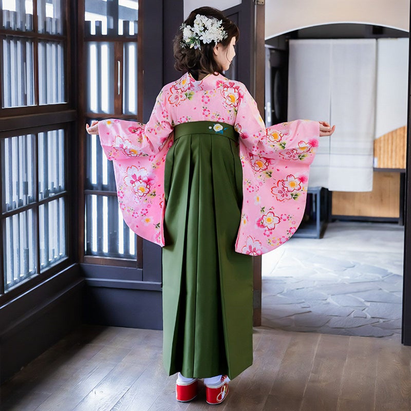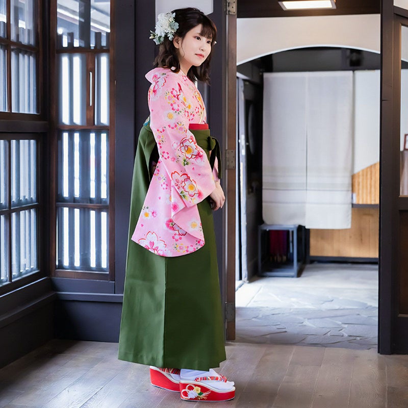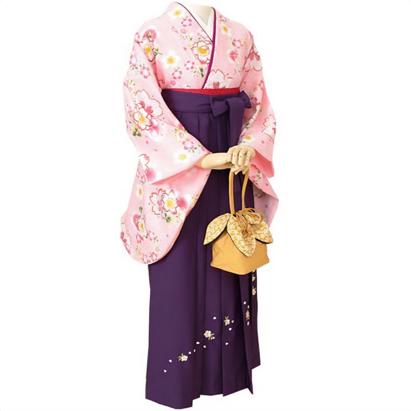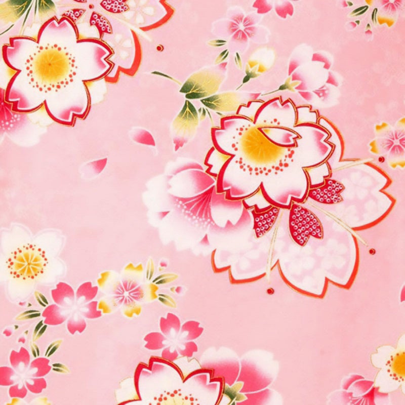 【色柄】清楚なピンク地に、いろいろな形の桜を重ねた、桜尽くしのお着物です。見ているだけで楽しくなるような、晴れの日にふさわしい明るく華やかなお着物です。
