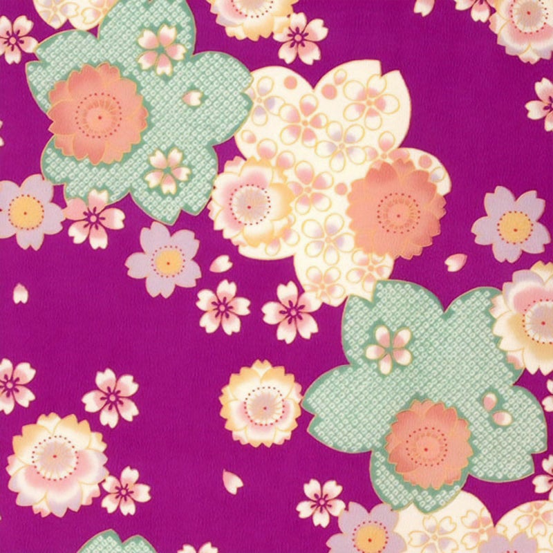 【色柄】鮮やかな紫地に、疋田や梅で彩られた愛らしい桜文や、様々なデザインの桜をちらしました。モダンレトロな趣の、桜づくしのお着物です。