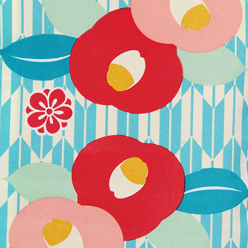 【色柄】基本コンセプトは、かわいさいっぱいのレトロモダン。水色とクリーム色の矢絣に、ほっこりと愛らしい椿の花をちらしました。アンティークな雰囲気とともに、どこかポップなテイストを感じさせるデザインです。