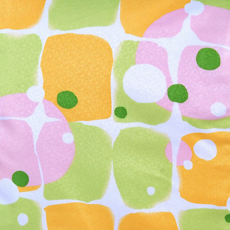 【色柄】白地に、黄緑・黄色で角丸の四角を並べ、ピンクや白・緑の水玉を飛ばしたポップな文様のお着物です、カラフルな色の取り合わせ、元気な文様が心浮き立つデザインです。