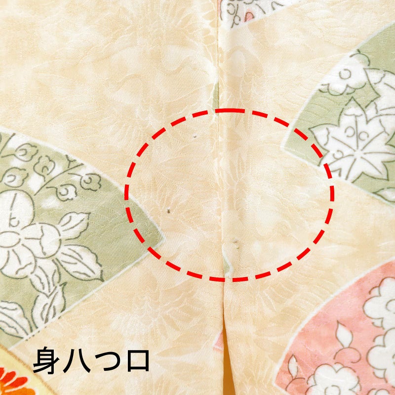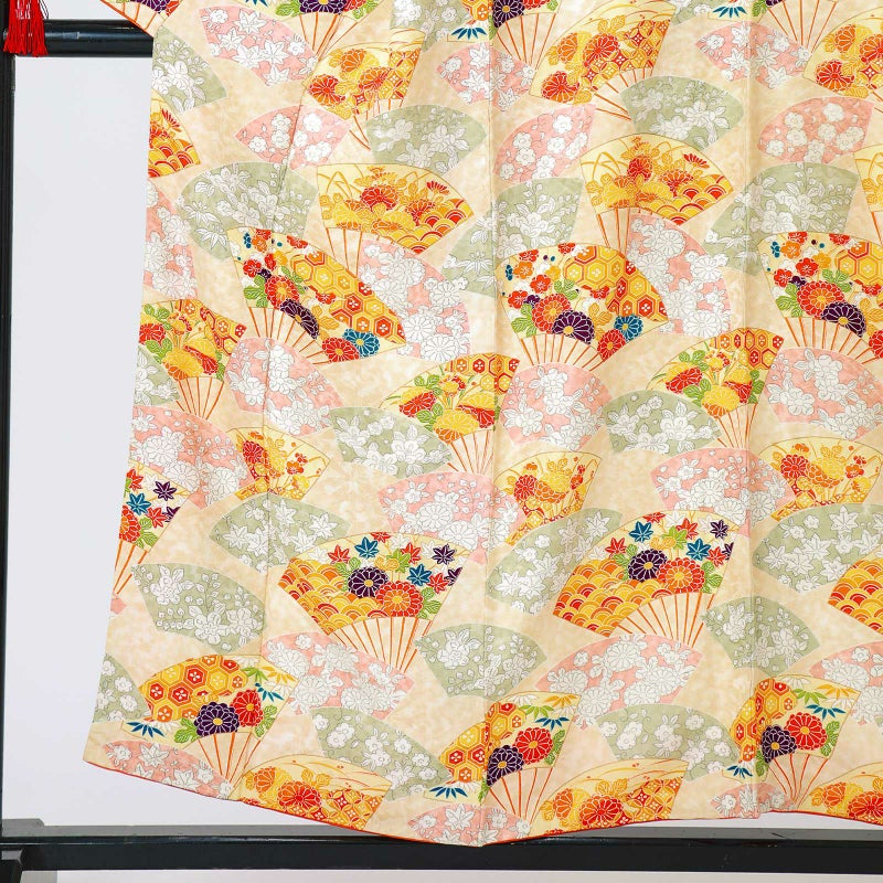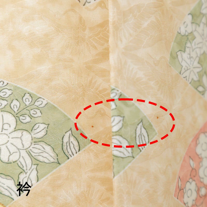 4. 【中古品】仕立て上がり 袷着物「向鶴文 扇と吉祥尽くし 薄橙色」小紋【メール便不可】ss2512kck20