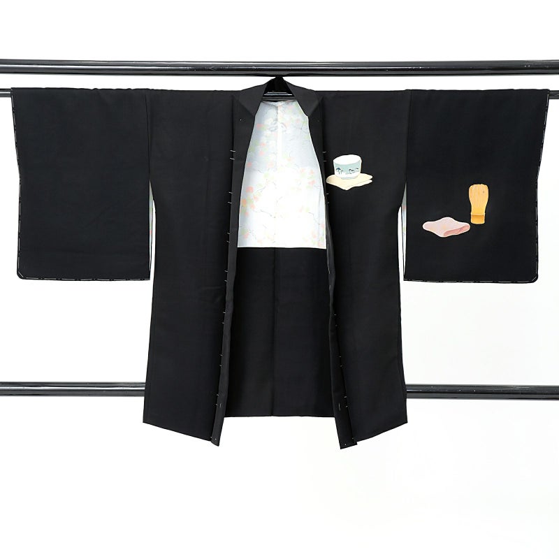 難:左前見頃(椀と懐紙)シミ、左袖(茶筅と袱紗)シミ、右前見頃下汚れ