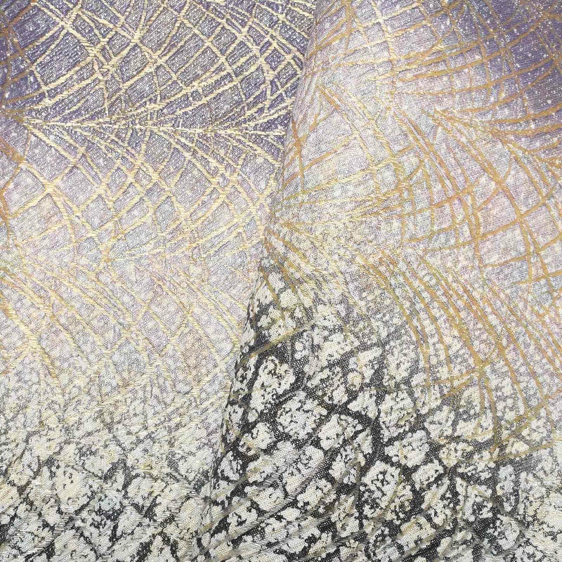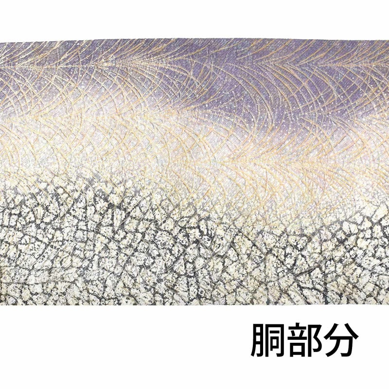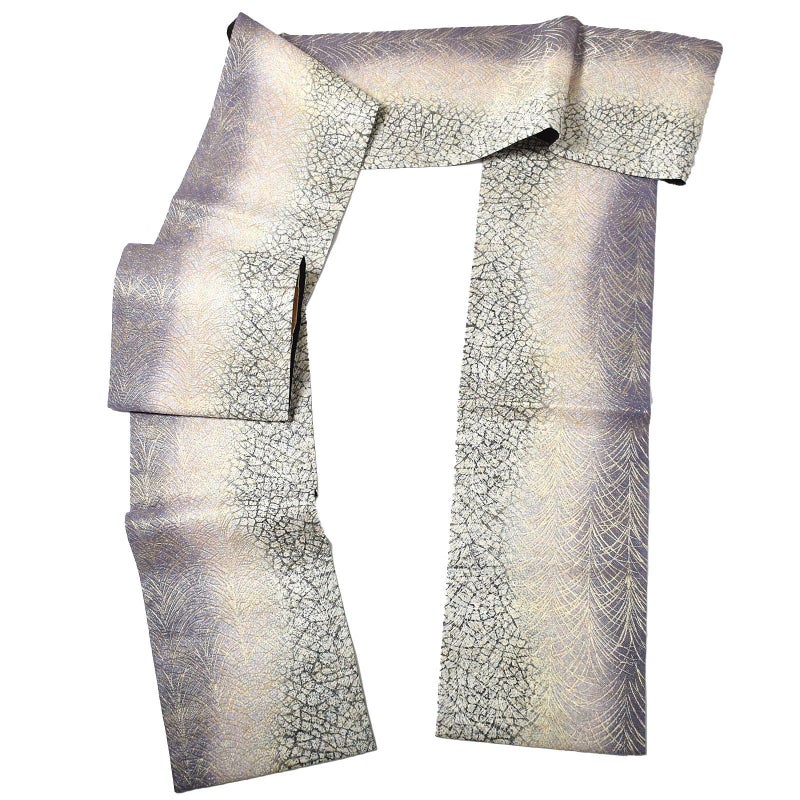 藤色を縞にぼかしたように織り出した地。特殊な箔と金銀糸や色絹糸を巧みに使用した変わり綴れの織物です。まるでさざなみのようにキラキラと繊細に輝きます。図柄は氷割れ文や芝を現代的にアレンジされています。