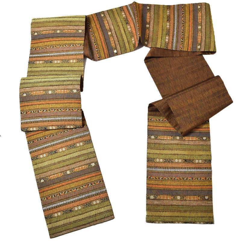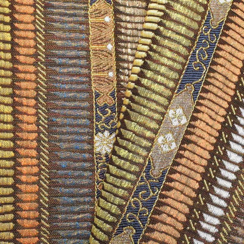 つづれ織と錦織で甲冑を織り出した袋帯です。つづれ織は使用すればするほど地風が柔らかく変化し、身体に馴染んで締めやすくなるのが特長です。「出陣」は武士の大鎧の威しをイメージして織られており、晴れの日を祝う祝賀のイベントにひときわ華やかさを添える格調高い袋帯です。腰のあるとてもしなやかな風合いです。