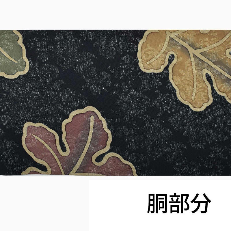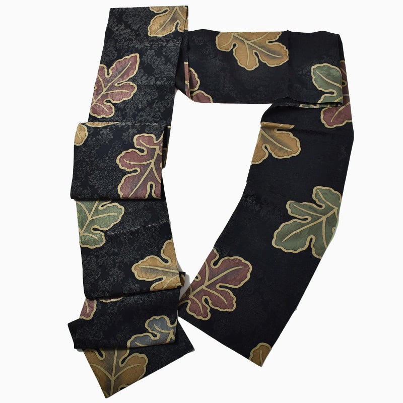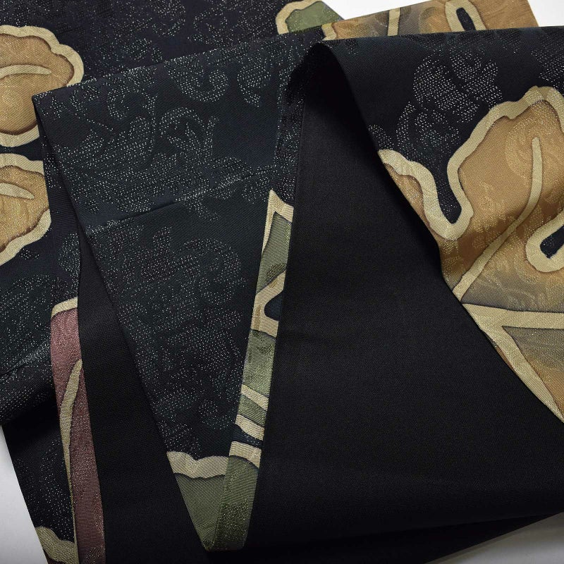 張りのある黒の帯地に大きな柏葉と、銀糸でアラベスク調の柄を織り込んだ洒落帯です。見る角度で銀糸が輝き、アラベスク調の文様が浮かび上がる表情豊かな帯です。