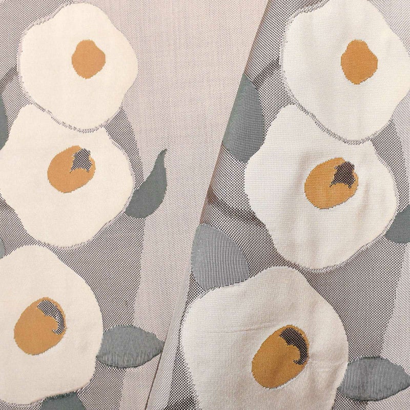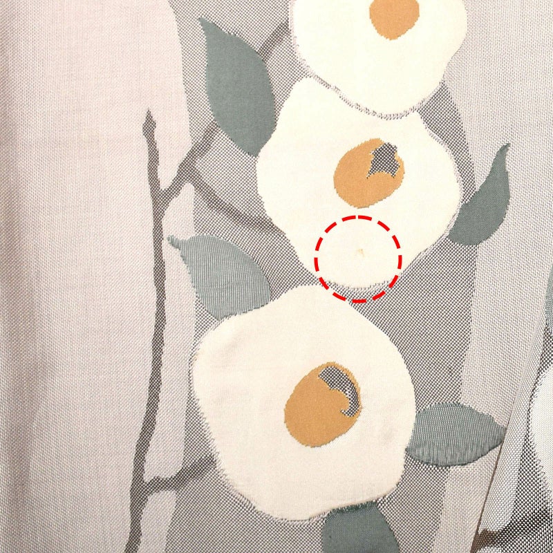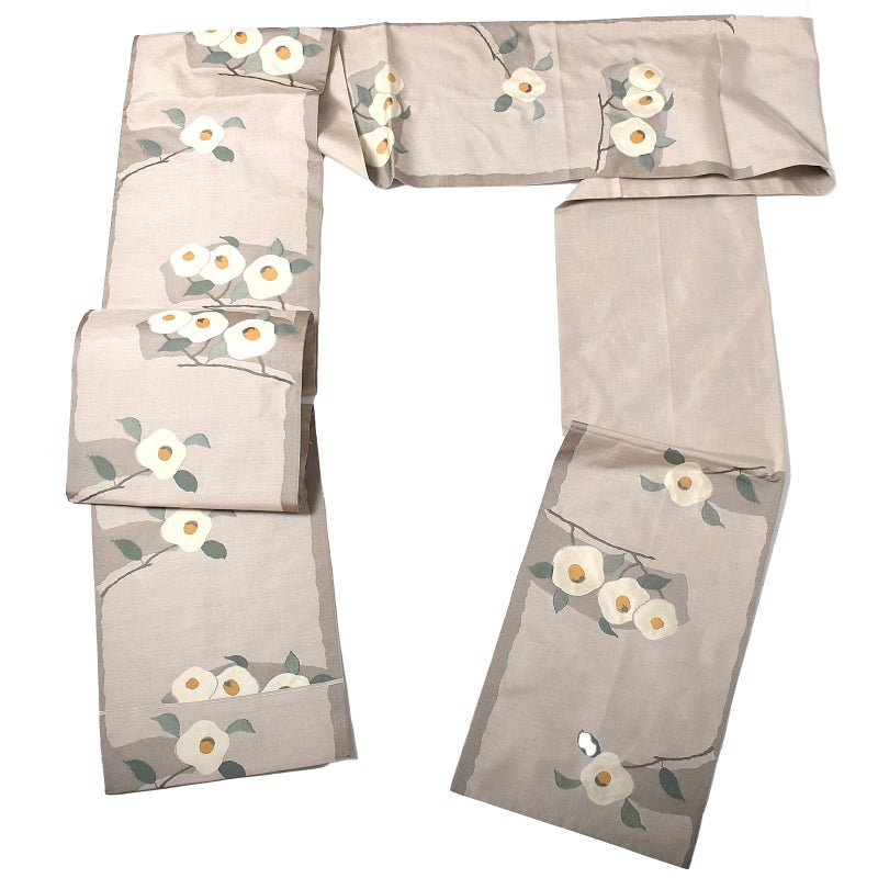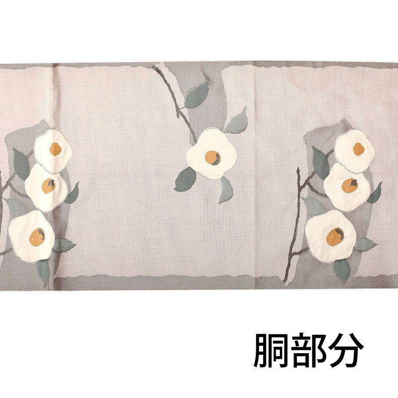 張りのある帯地に白椿を帯全体に渡って配されている全通柄の袋帯です。全体的に彩度を抑えた色味で統一されており、可憐な丸椿がポイント。着物次第で可愛らしくも大人っぽくも着こなせる帯です。