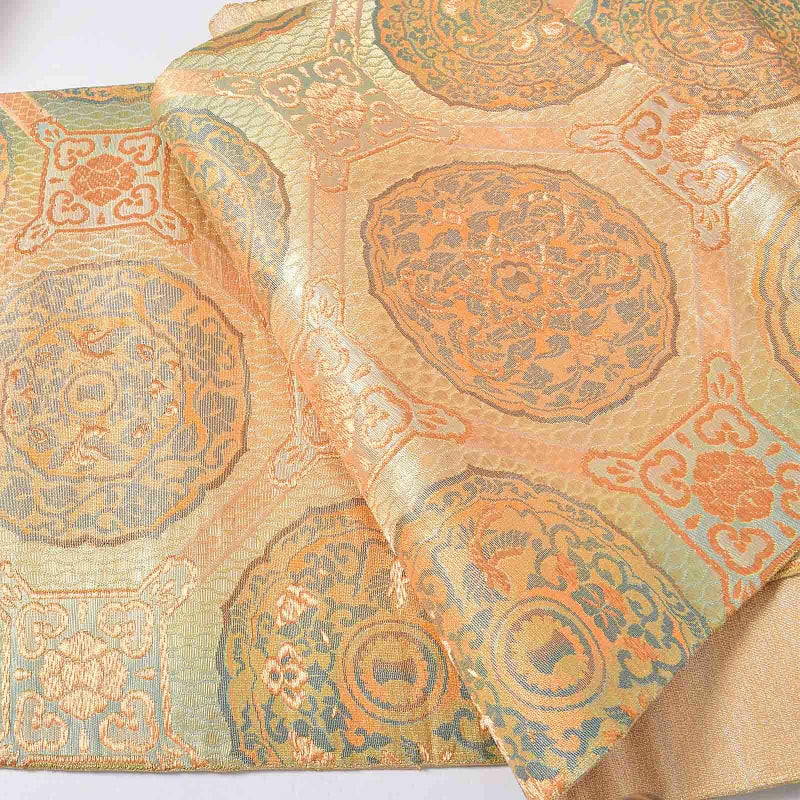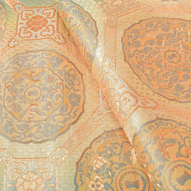 落ち着いた色合いの上品な煌びやかさのゴールド。蜀江文に向い鳥や唐草などの正倉院文様の格調高い模様。