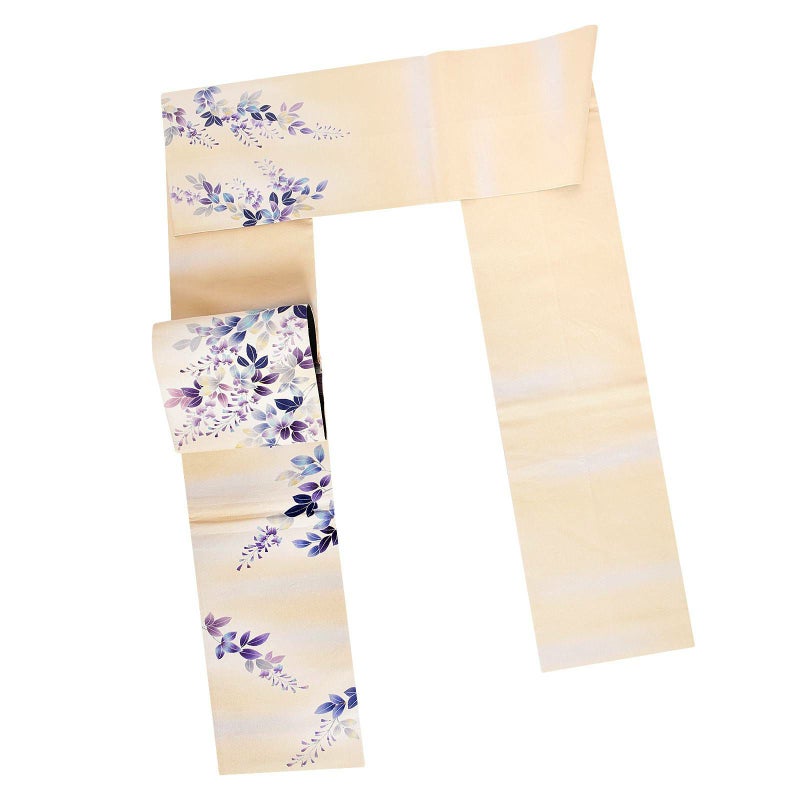 白の段暈し塩瀬地に手描き友禅。藤、白藤、菫など紫のトーンで藤もどきを印象的に表現している洒落袋帯です。裏地は古代紫・墨色、灰色の織りで表現された段暈しとなっており、リバーシブルでお使いいただけます。花文様は着用する季節を限定しないように工夫されています。やまとなでしこのように上品で清らかな美しい柄ですので、帯を主役にした着こなしはいかがでしょうか。