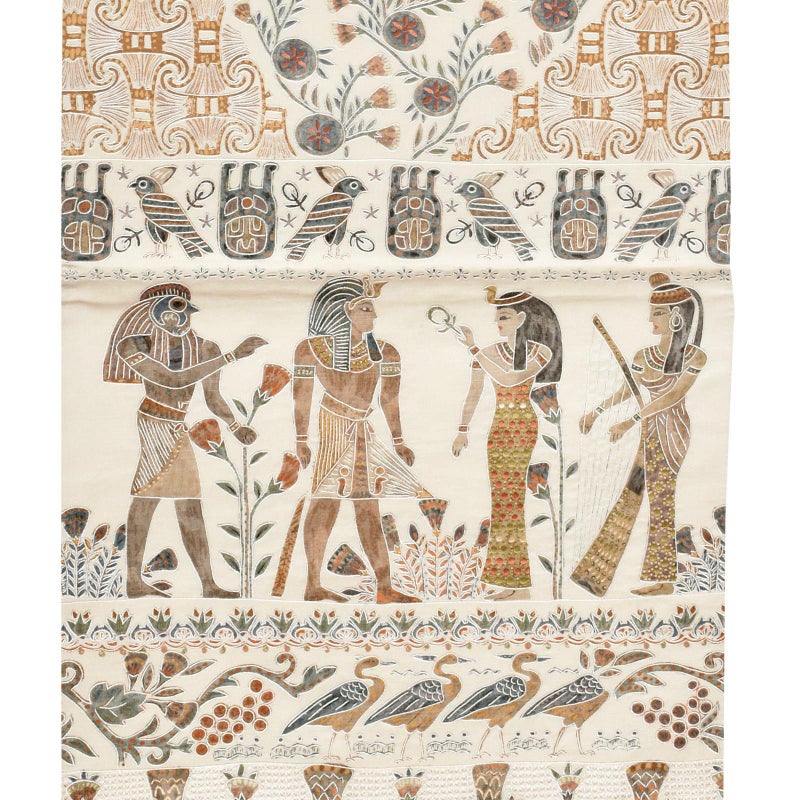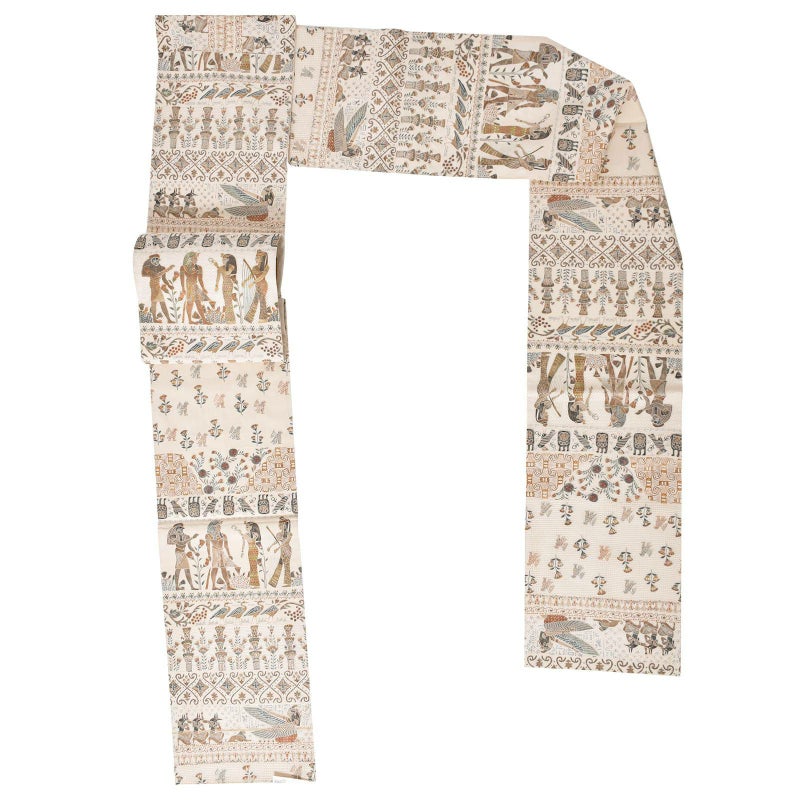 汕頭刺繍とは中国の汕頭(すわとう)で生まれた刺繍技法です。清時代にヨーロッパから渡来した宣教師が欧州のレース刺繍技術を伝え、それが中国の古来からの技法に取り入れられて発展したと言われています。非常に繊細で意匠の凝らされた技術のためその価値は非常に高く、数百万円で取引される帯もございます。本商品は古代エジプトの神々やホルスの目、動物、アヌビス、象形文字彫刻のデザインの袋帯です。古代エジプトの文化が好きな方には溜まらない逸品です。