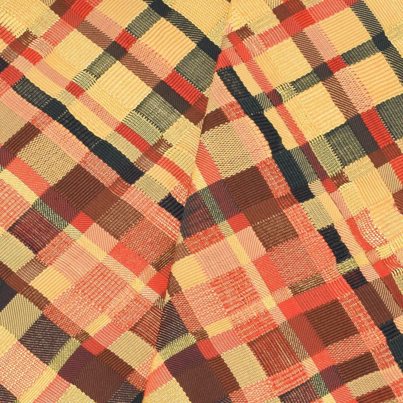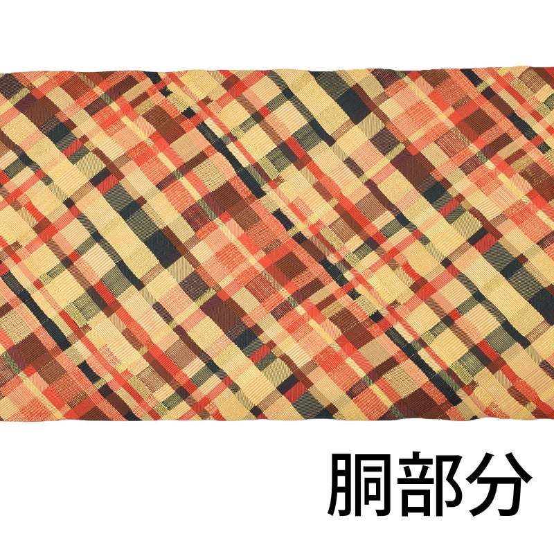赤、金、黒、黄のビビッドカラーで織られた鮮やかな袋帯です。金糸が織り込まれているので、角度によって帯地が輝き、大胆さと高級感があります。