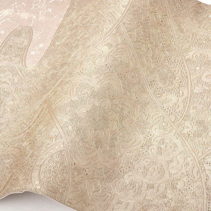 ピンクベージュ地に刺繍が施された上品な袋帯です。