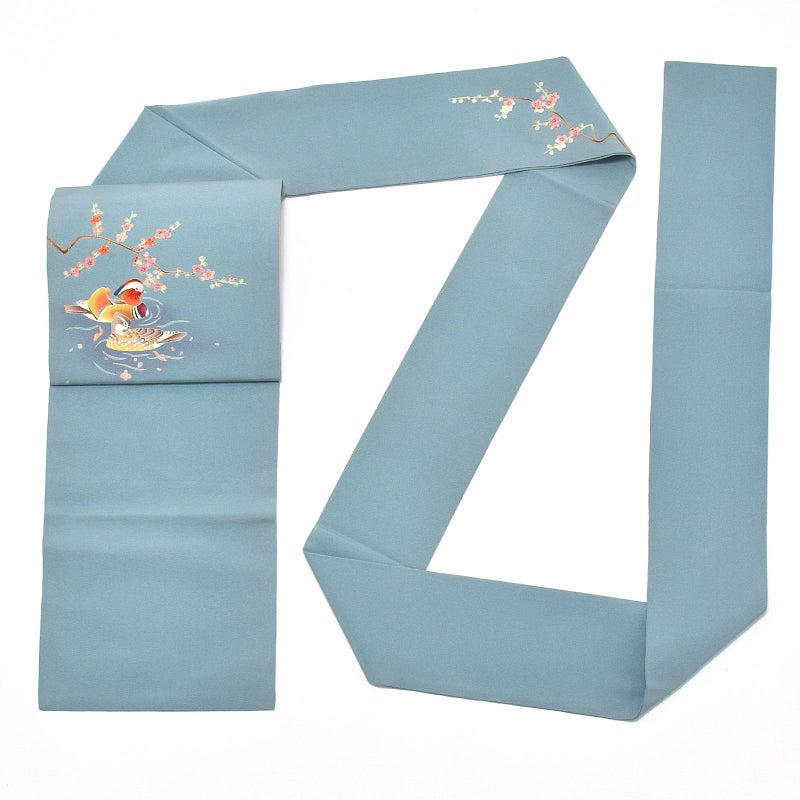 五彩と言われる臙脂・藍・黄土・草・古代紫を基調とし、写実的な草花模様や、外暈しの技法を特徴としています。本商品では、梅のかかる湖上に寄り添って泳ぐ鴛鴦を加賀友禅の染色技法で描かれている素敵な逸品です。