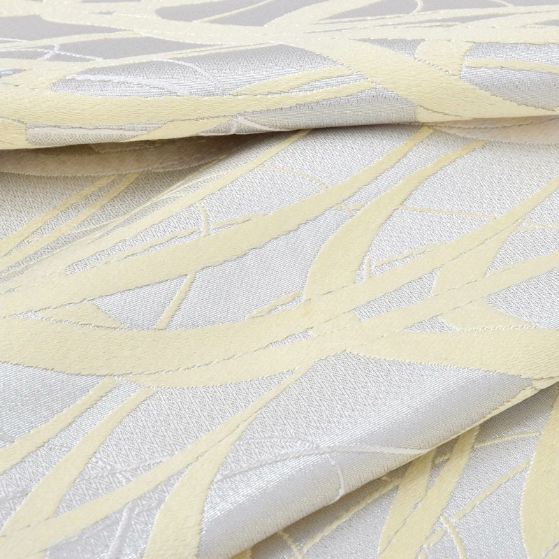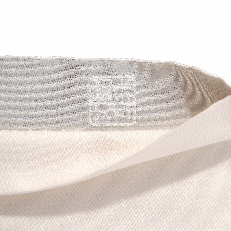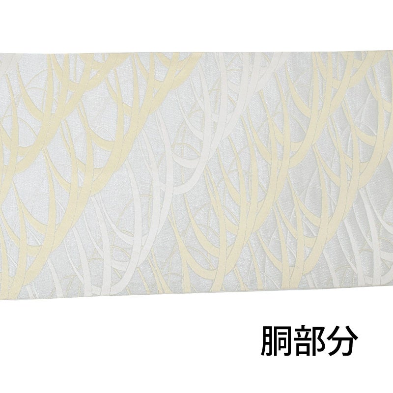 人間国宝北村武資(重要無形文化財保持者「羅」および「経錦」)の袋帯です。細かな菱紋を織り出した銀の地に、白と練色の曲線を連ねた旋風を思わせるデザイン。曲線部分は唐織のような立体感があります。伝統的な技術と現代的な感性が織りなす美しさが魅力です。色留袖、訪問着、付下、色無地のコーディネートにおすすめです。