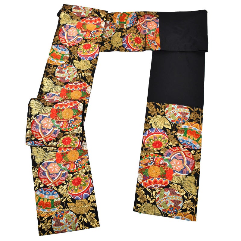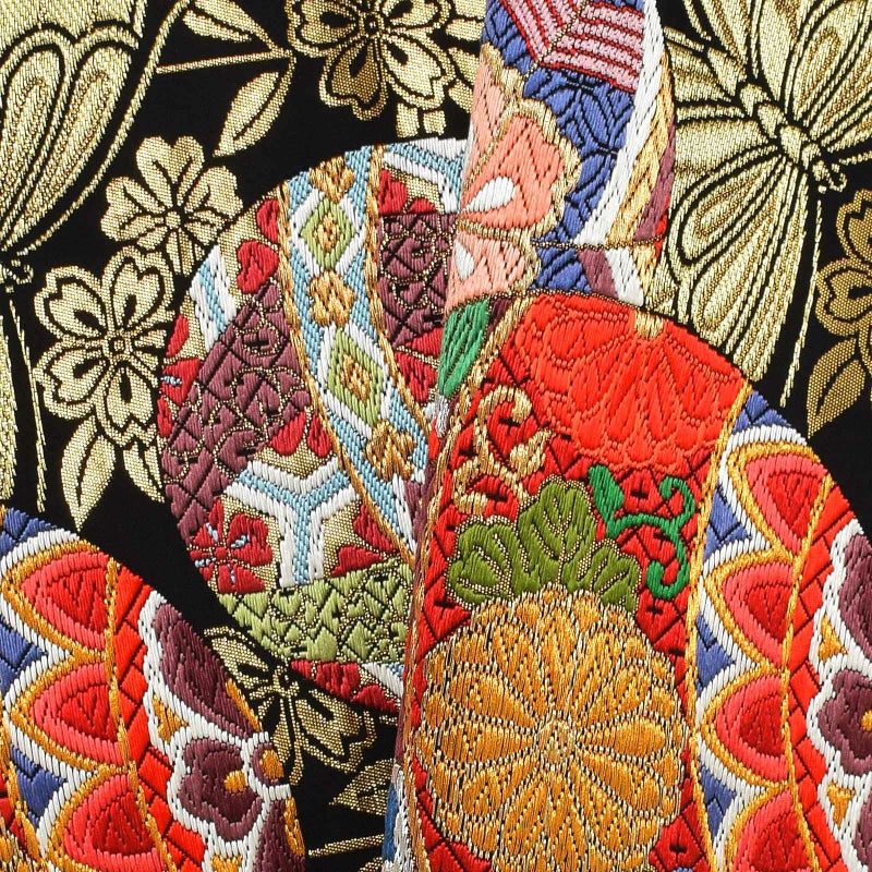 華やかな振袖に負けない豪華な唐織の袋帯です。黒地に金糸をふんだんに使用した織のコントラストが美しく、カラフルなので様々な色の振袖にもコーディネートしやすいデザインです。