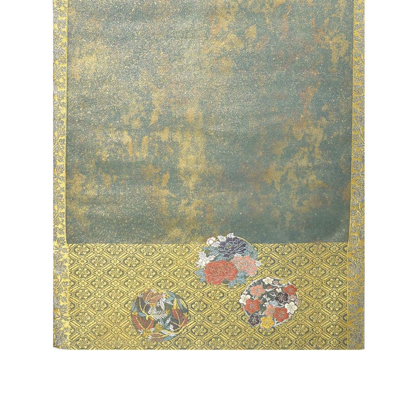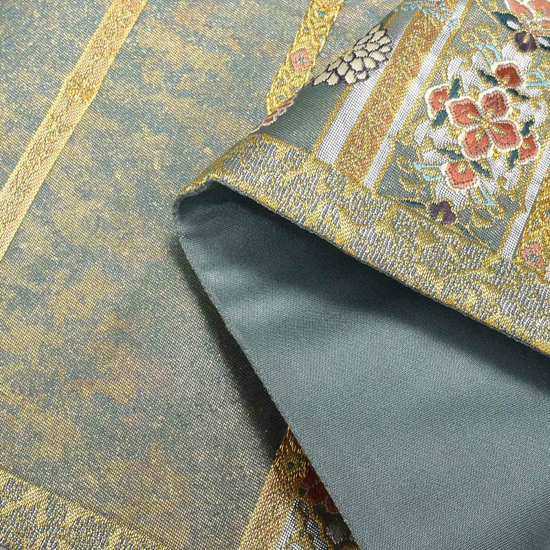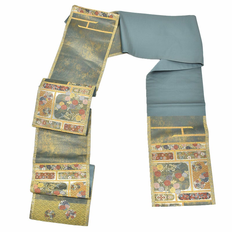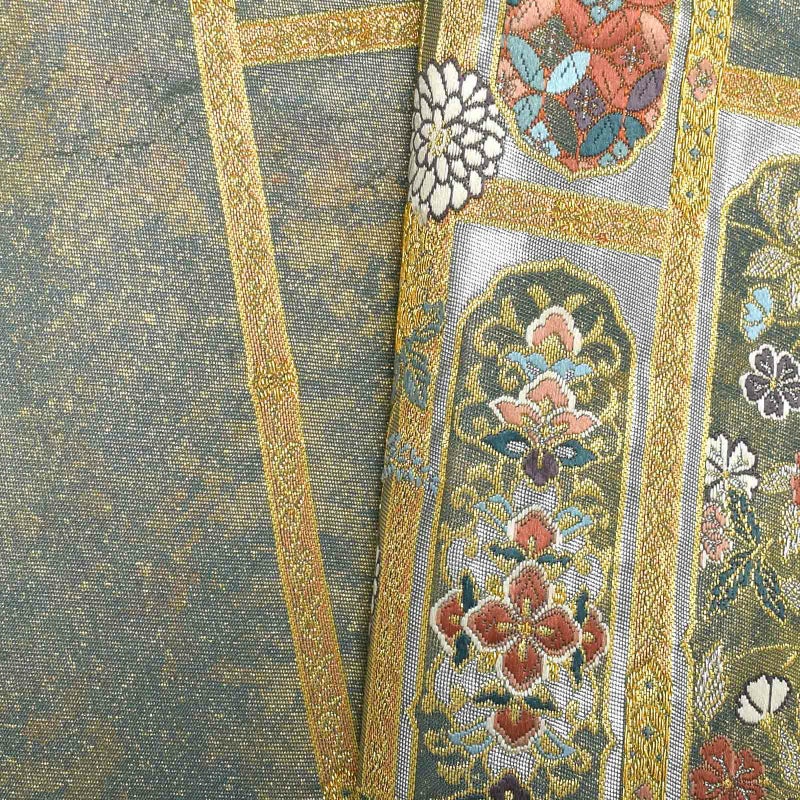 豪華絢爛な装飾を施された室内に、菊が豊かに咲き誇り小窓から零れでている様子を配した華やかな袋帯です。金銀糸の織りが、七宝繋や亀甲、四友などの華やかな吉祥文様に煌びやかさをより一層引き立たせている逸品です。
