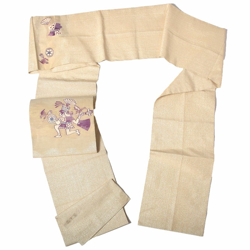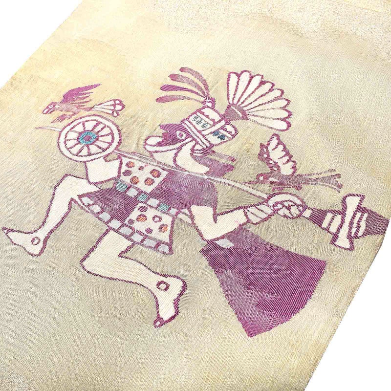 金糸で施された帯地にインカ/アステカ帝国時代と思われるモチーフがつづれ織りでデザインされてる帯です。
