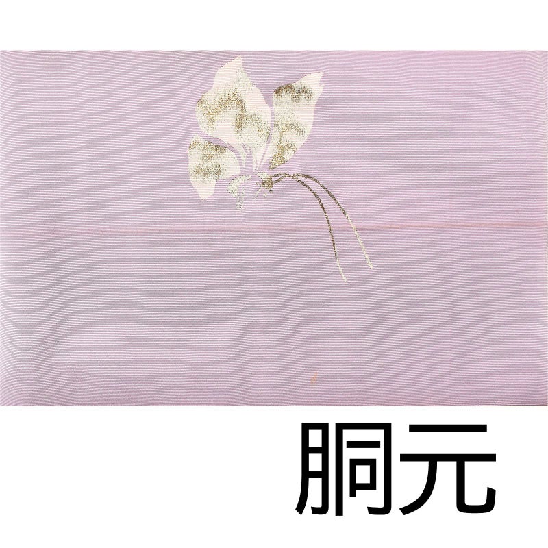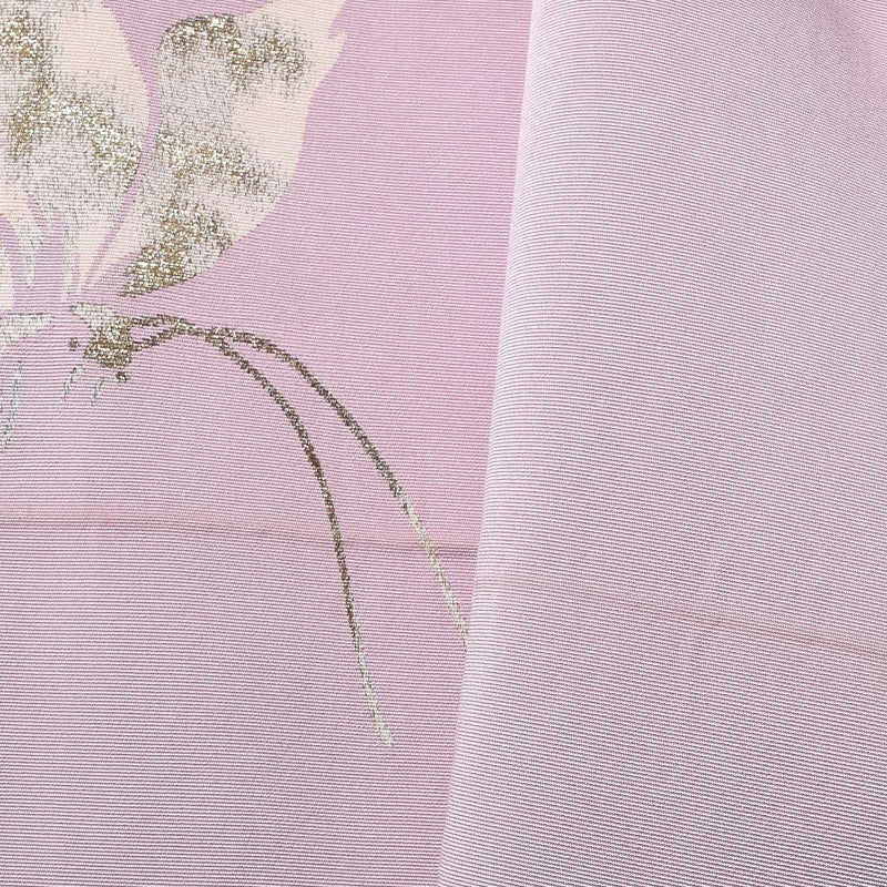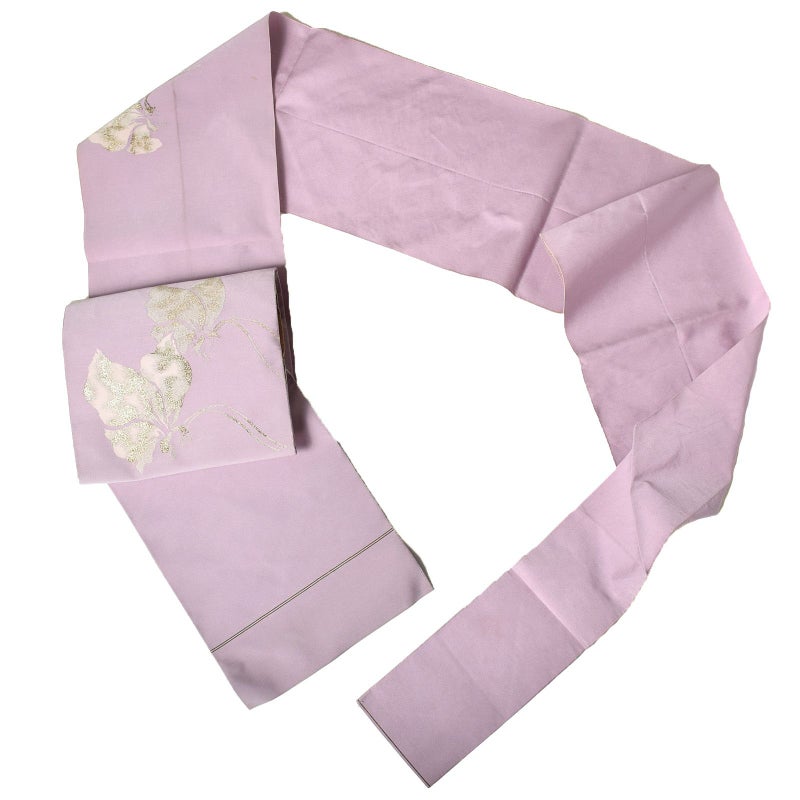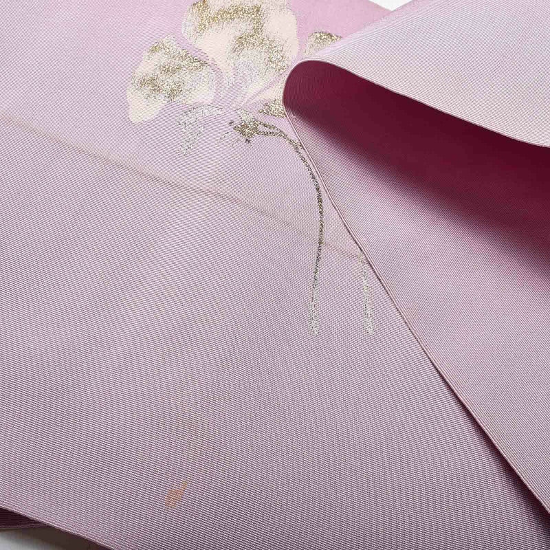薄紫地に、蝶をつづら織りで配した織りの名古屋帯です。2匹の羽部分が、一方はぼかしで、一方は金糸で表現されているので、蝶が立体的な印象です。締めやすいようにかがり仕立てになっています。