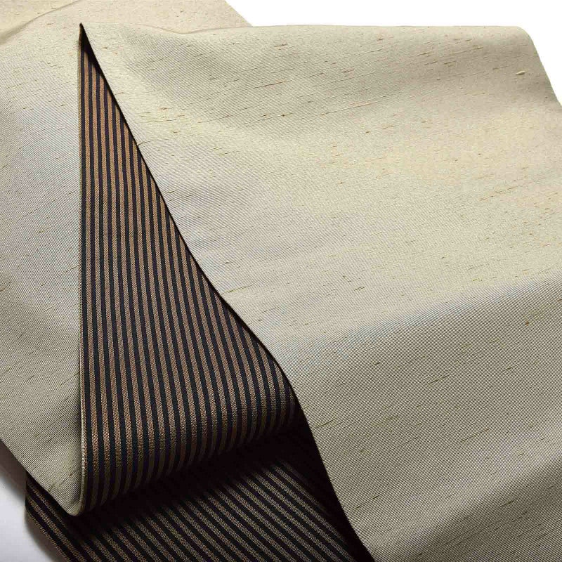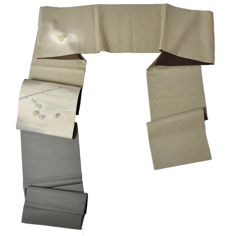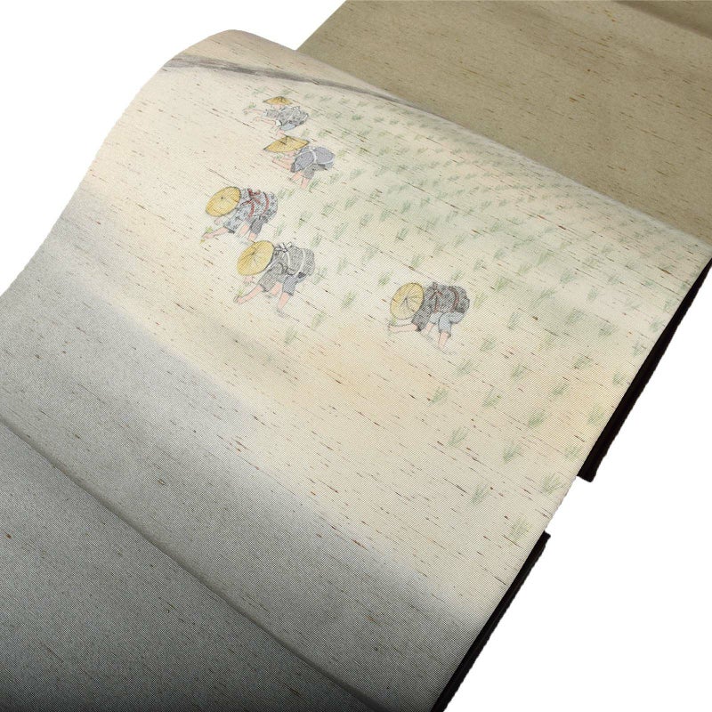 紬地に仕立て上げられた染めの袋帯です。胴の幅をお好みで締められます。薄緑色の濃淡のグラデーションに田植えの風景が、人の営みの情緒を豊かに表現しています。