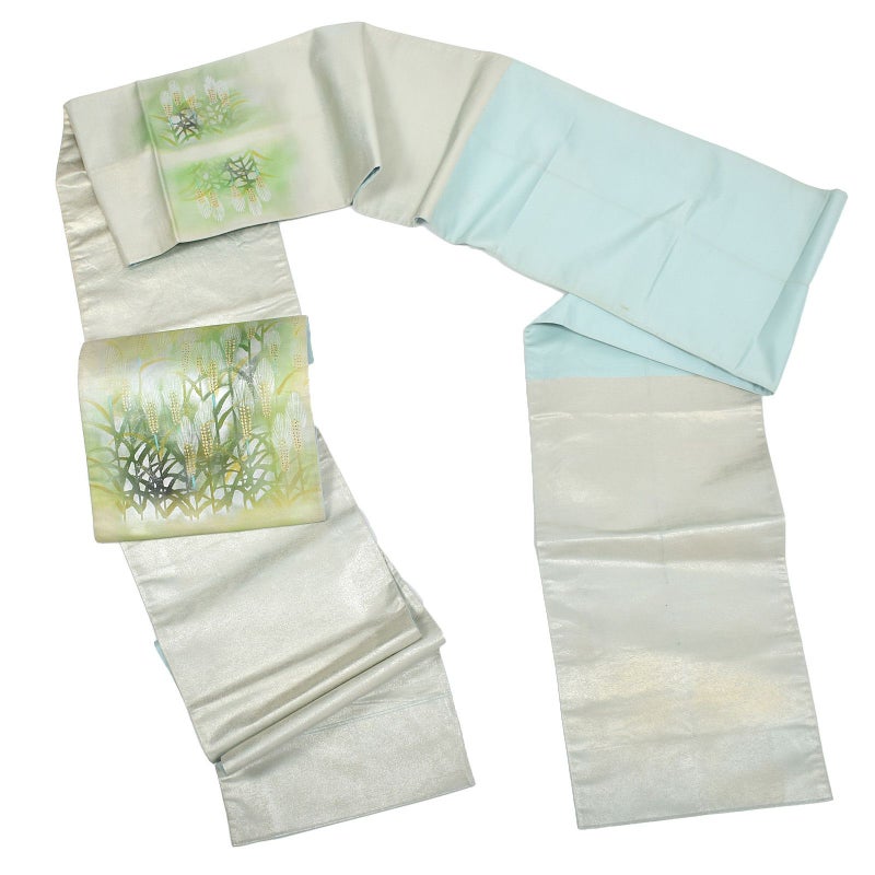 お洒落な大人のおでかけに 【中古品】仕立て上がり 袋帯 「白緑に麦」 洒落帯 正絹 【メール便不可】