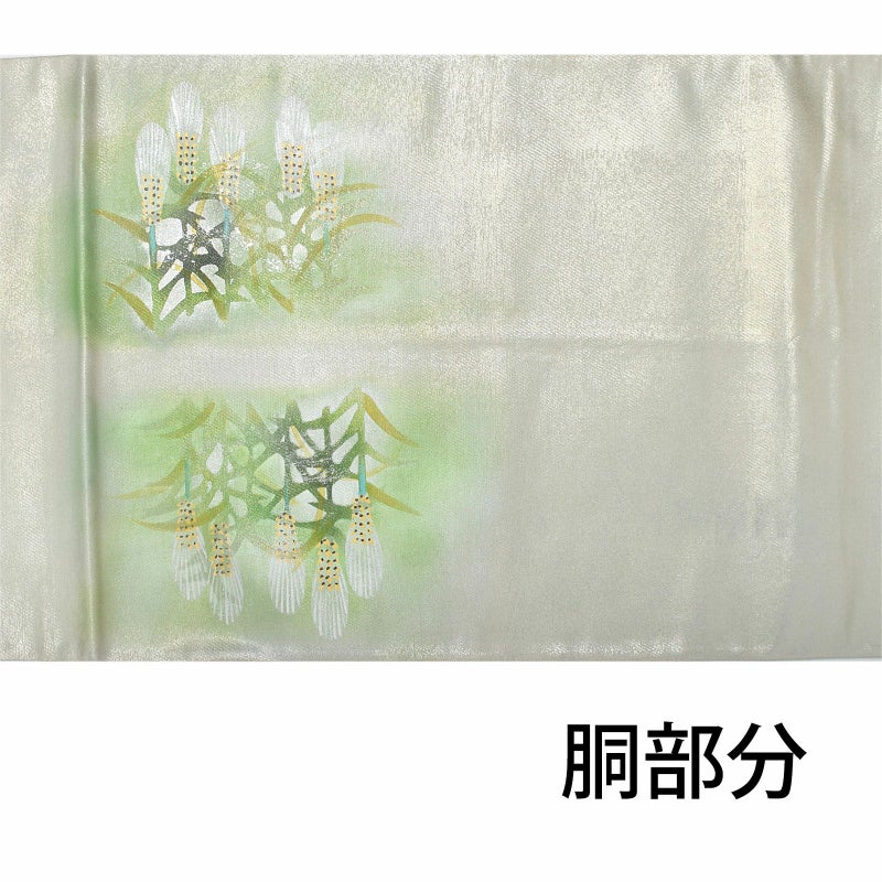 銀糸の引箔の帯地に、お太鼓部分は生い茂る麦を配した染めの袋帯です。