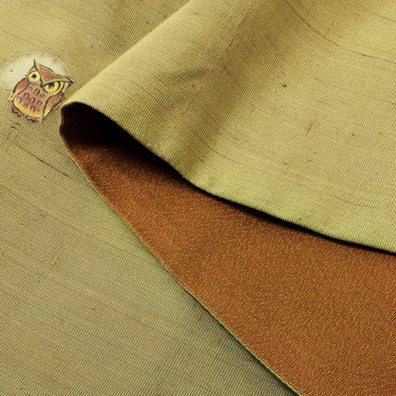 正絹の紬地を草色と芥子色に染め、まるで森の中にいる可愛らしいフクロウを表現した袋名古屋帯です。生地感はつやつやした上質な紬を使用しております。フクロウ好きさんにはたまらない一品です。