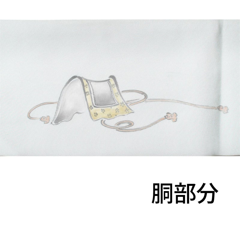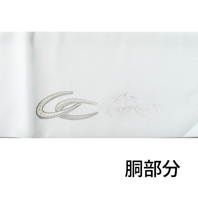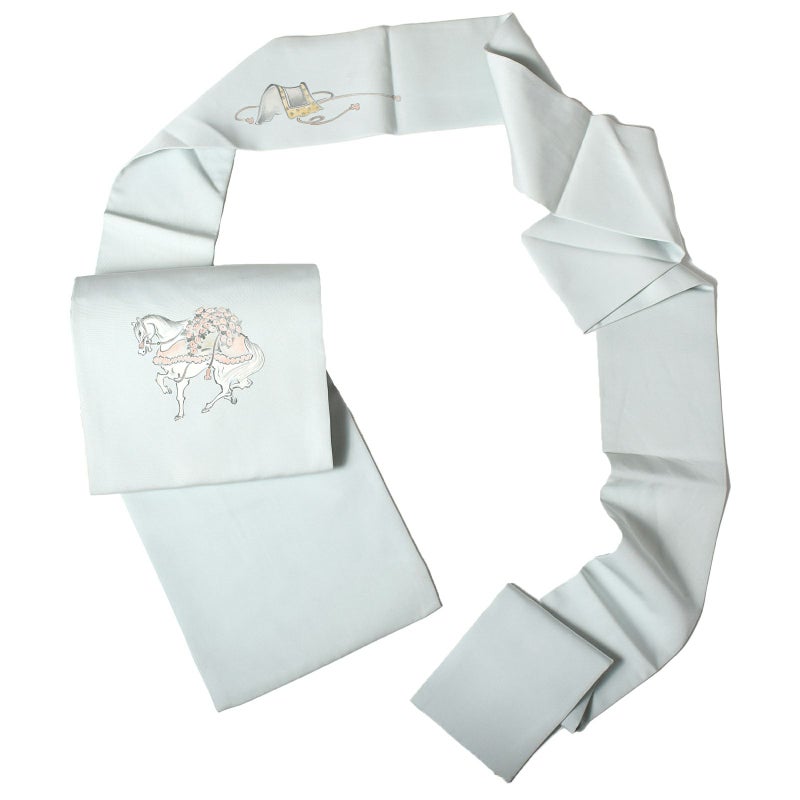 滑らかで上質な塩瀬に、お太鼓部分に馬柄が描かれた染めの名古屋帯です。胴部分は一方は蹄鉄、反対側は鞍が描かれ、胴に巻く向きを変えることでお好みのほうの柄を見せることができます。薄い色合いで描かれているので、質感だけでなく雰囲気もやわらかで上品な印象です。