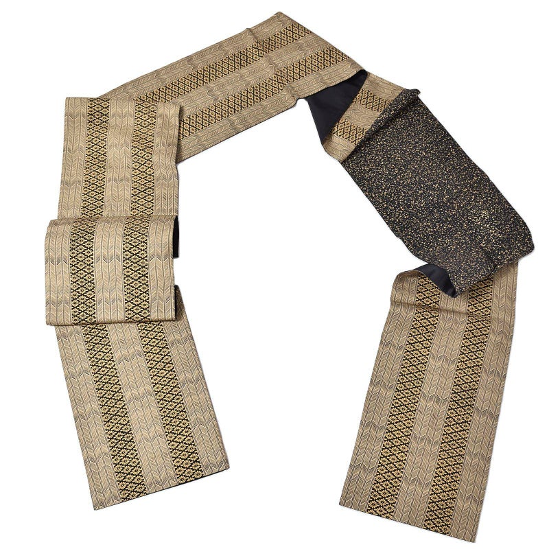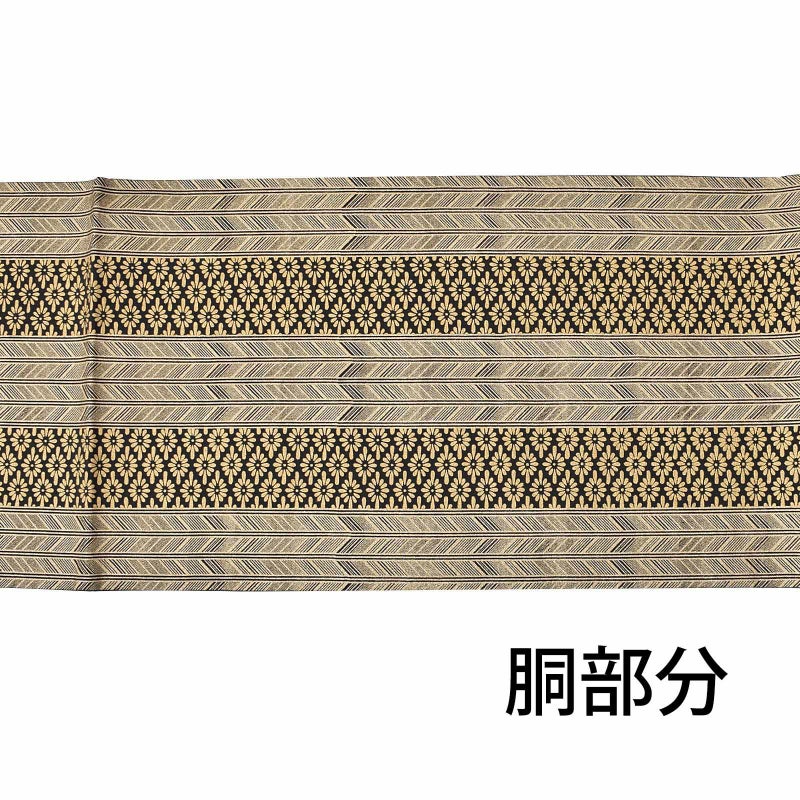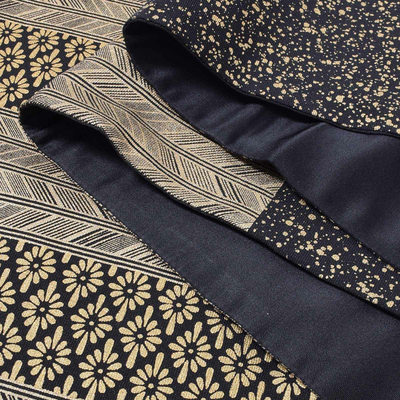 金箔を贅沢に使用した染めの袋帯です。黒地がきりりと雰囲気を引き締め、柄は人気の菊の花柄と矢羽根なので、お手持ちの着物にとても合わせやすいでしょう。見る角度によって箔が反射して見え、清廉な粋を感じさせます。