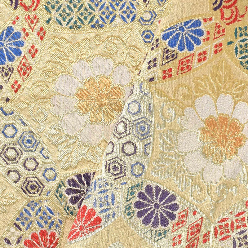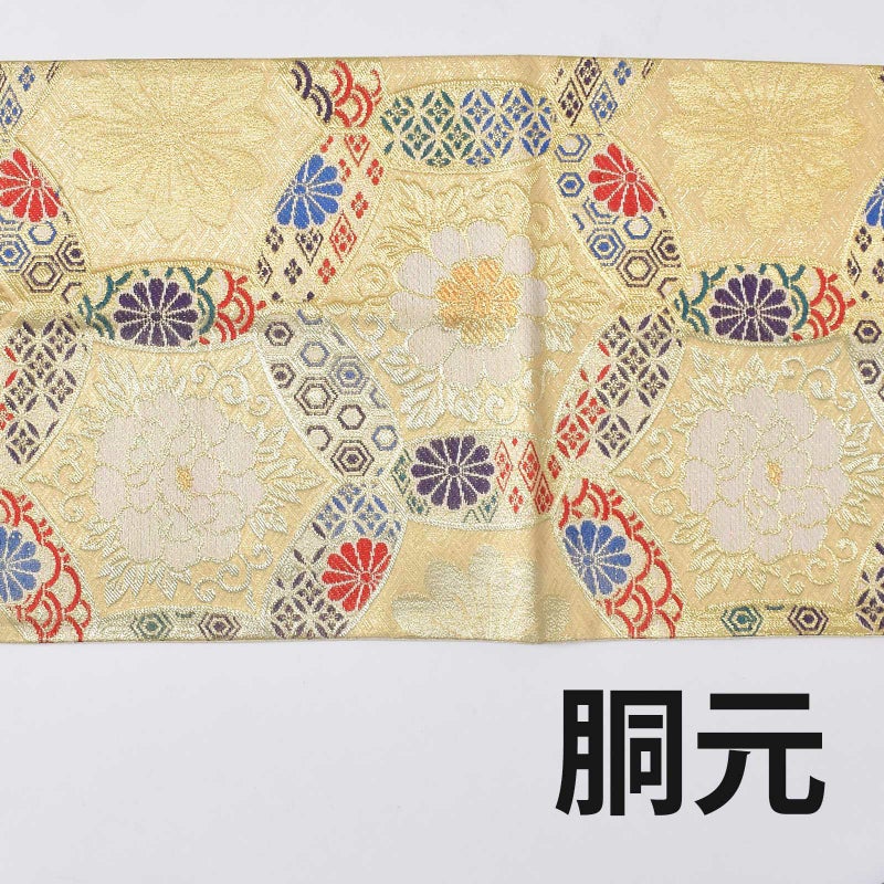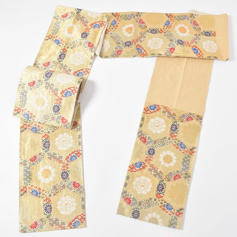 着付の練習や和雑貨の素材にもおすすめ 【中古品】「金 牡丹に亀甲花菱」仕立て上がり 袋帯 正絹 礼装用 振袖用【メール便不可】<T>