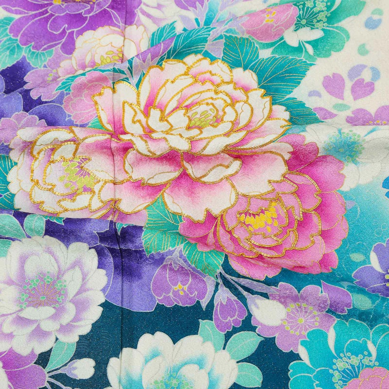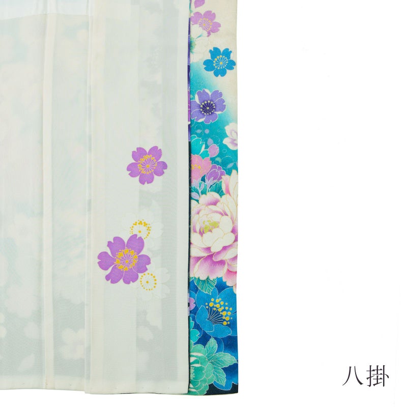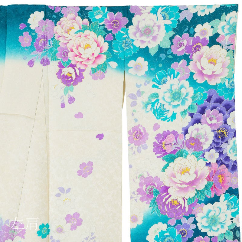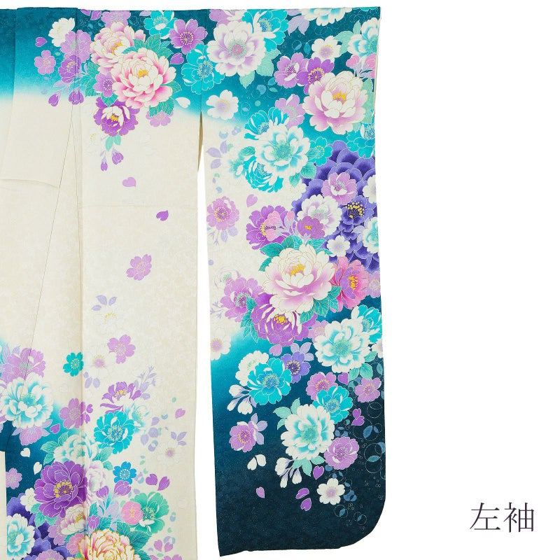 桜の地模様に金通しの細かなラメ感のある生地。オフホワイトに、肩や裾は鮮やかなターコイズブルー、ネイビーのぼかし。白にパープル、ブルー系の八重桜の上に、赤紫や水色の牡丹の花、金駒刺繍が豪華さと高級感を演出します。白地に桜の柄八掛。お花が咲きこぼれるデザインが晴れの日にぴったりの振袖です。