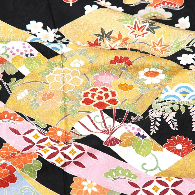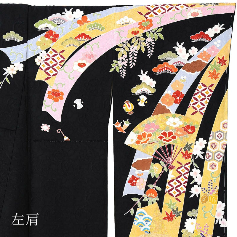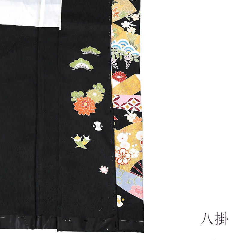 大きな薔薇の地模様が浮かび上がる黒の地。裾は赤のぼかし。白やブルーグレー、赤紫色などの吉祥文様が細やかに表現された蔓帯が背や裾に流れ、金茶に四季花文様の扇が配されています。周辺に分銅や鍵など宝尽くし文様。八掛は黒小桜の地模様。古典的な文様に、金箔の押さえた輝きが上品な格調高さを演出します。