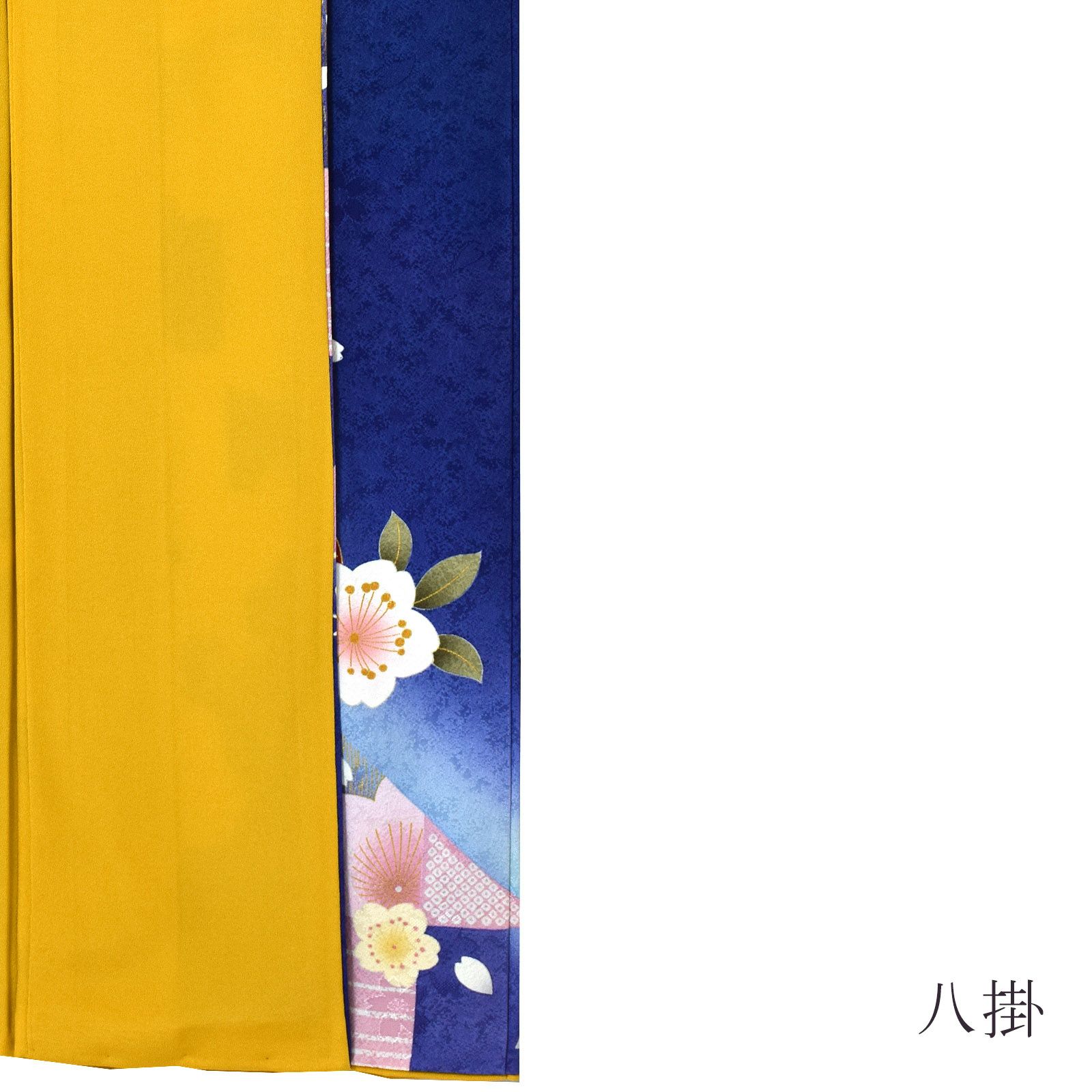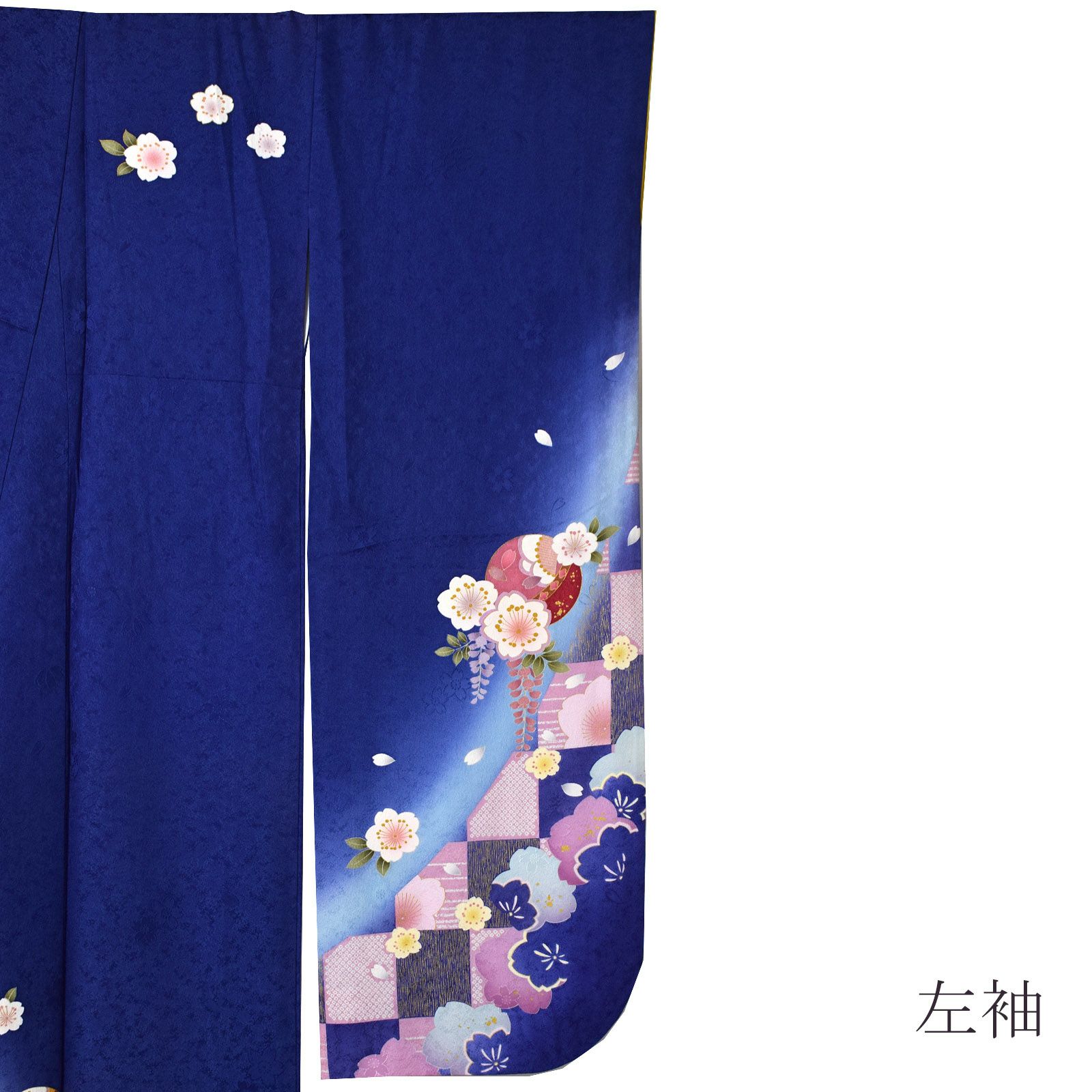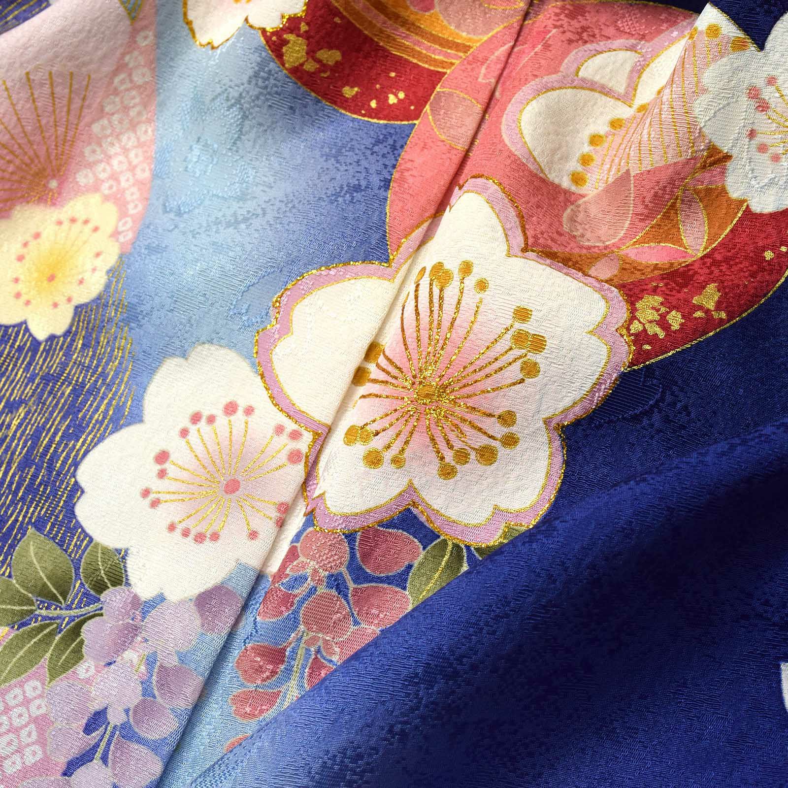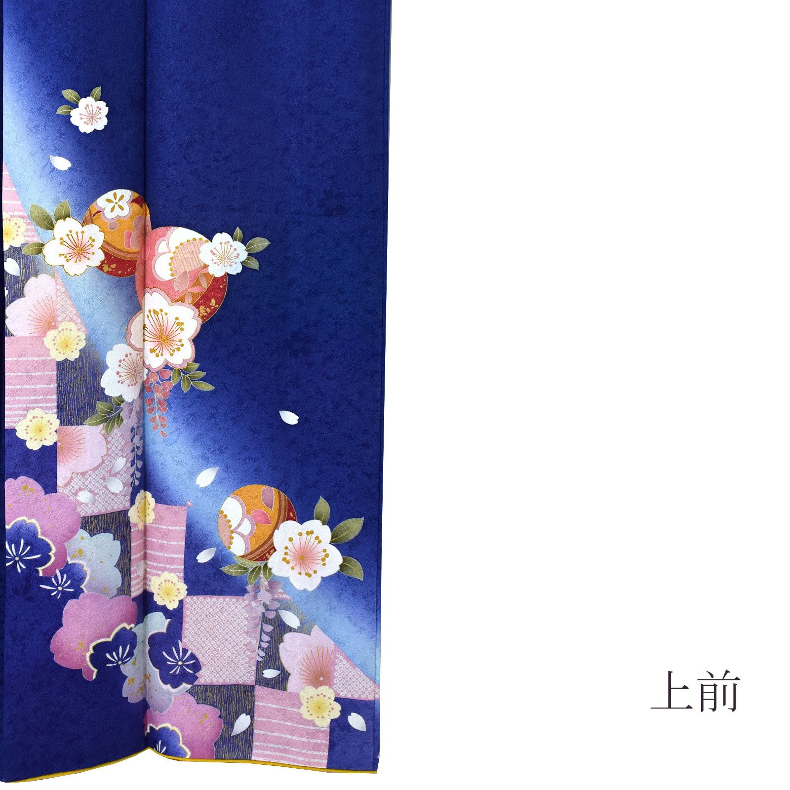 【色柄】桜の地模様のあるあざやかな紫みの深い青の地、裾や袖にピンクの疋田や金彩の入った市松模様。白にピンクぼかしの桜の花に金茶色や赤、手鞠が散らされています。八掛はあざやかな黄色。