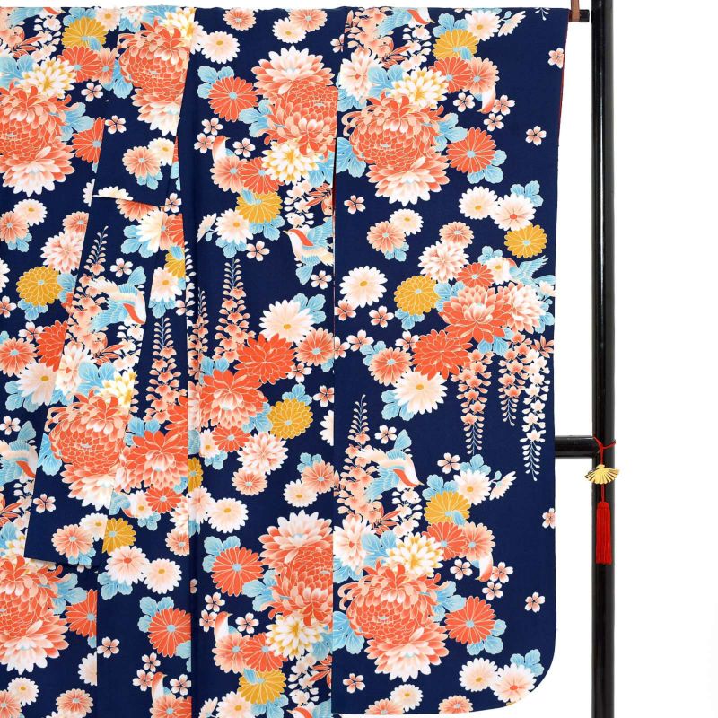 【色柄】菊に藤 鳥 紺色