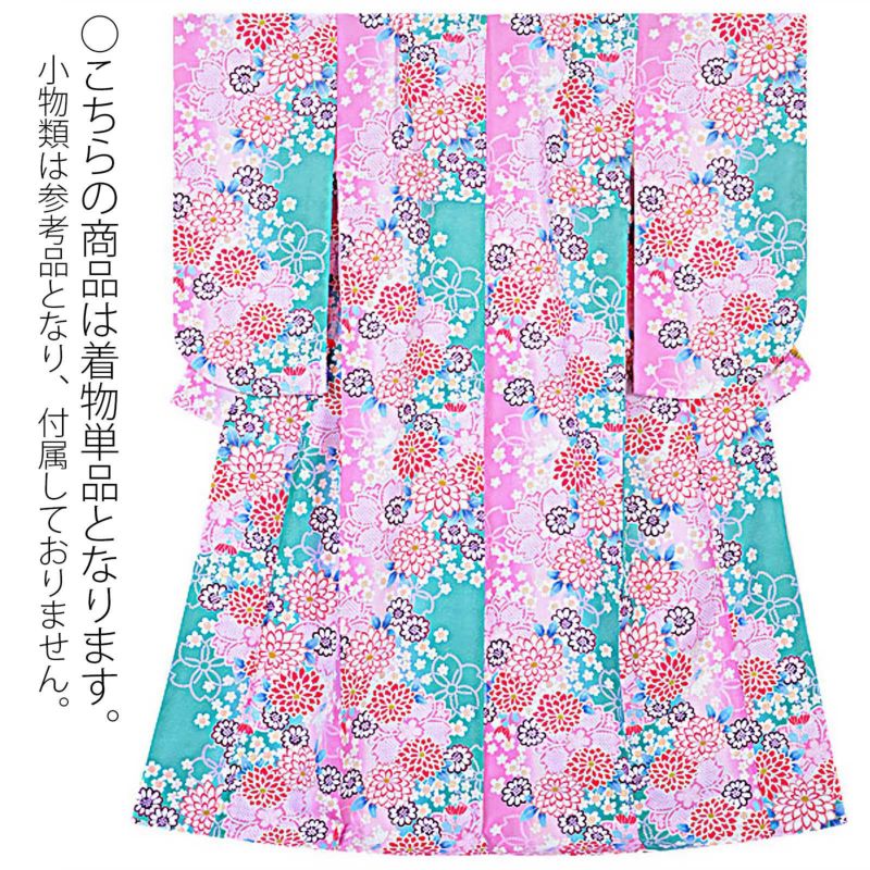 →襦袢はこちら→襦袢の身上げ・肩上げはこちら【カラー】ピンクと緑で暈し染めた地に、菊と桜の柄を表現して、ピンクの甘さが緑色により抑えられて、ほどよい可愛さのデザインです。