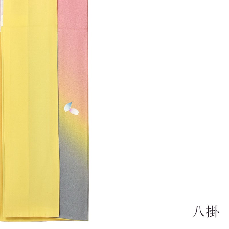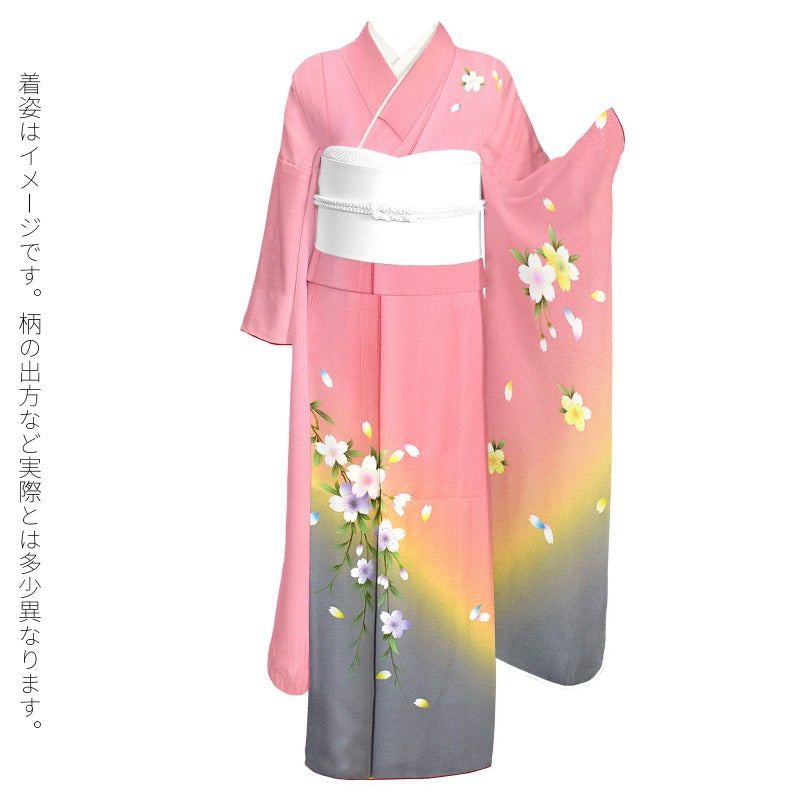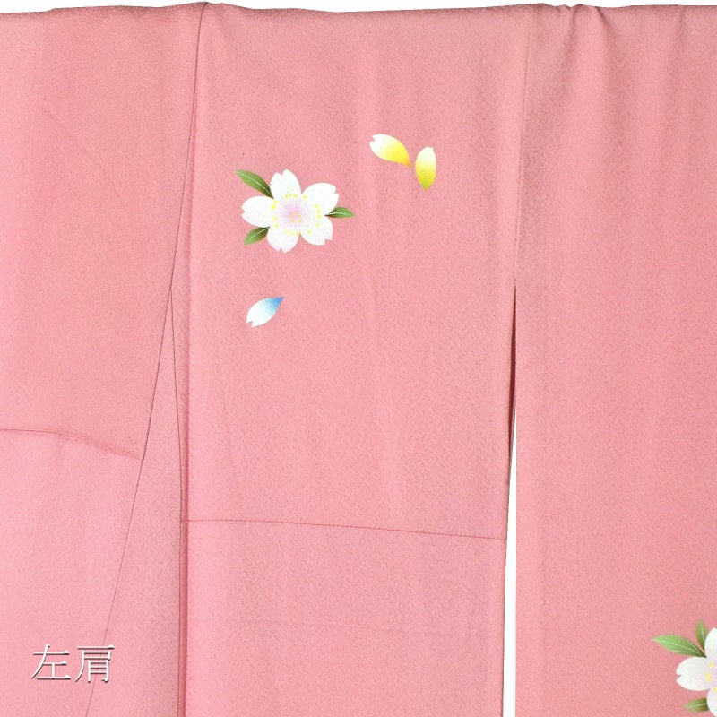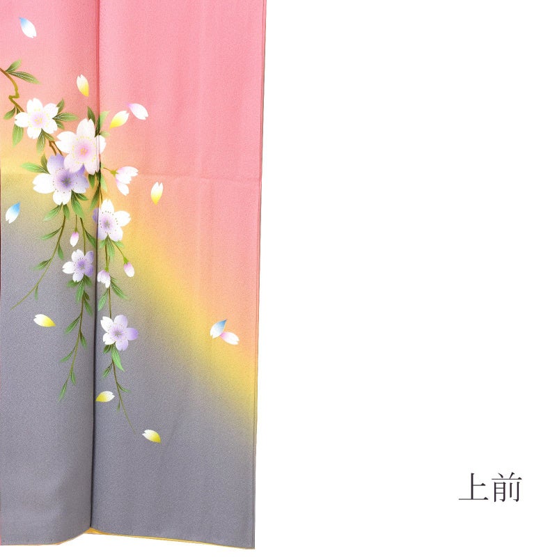 【色柄】やや鈍い赤みのピンク色の地に、淡い黄色、グレーの裾ぼかし。上前や肩、袖に枝垂れ桜の花。白い花弁に淡いピンク、薄紫、水色、黄色などのぼかし。蕊に金彩。緑の枝葉。八掛は淡い黄色。控えめな柄行が淑やか名印象です。